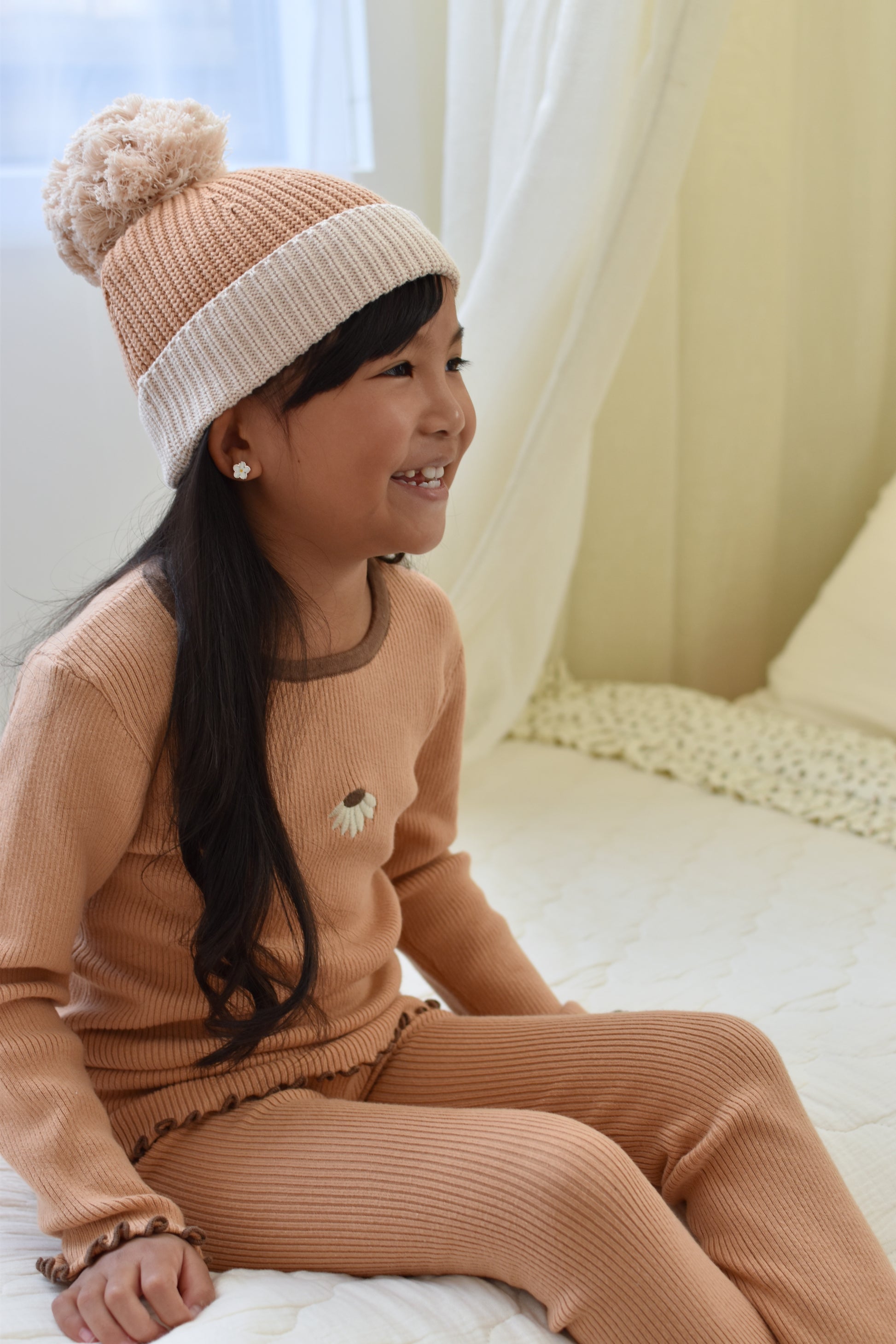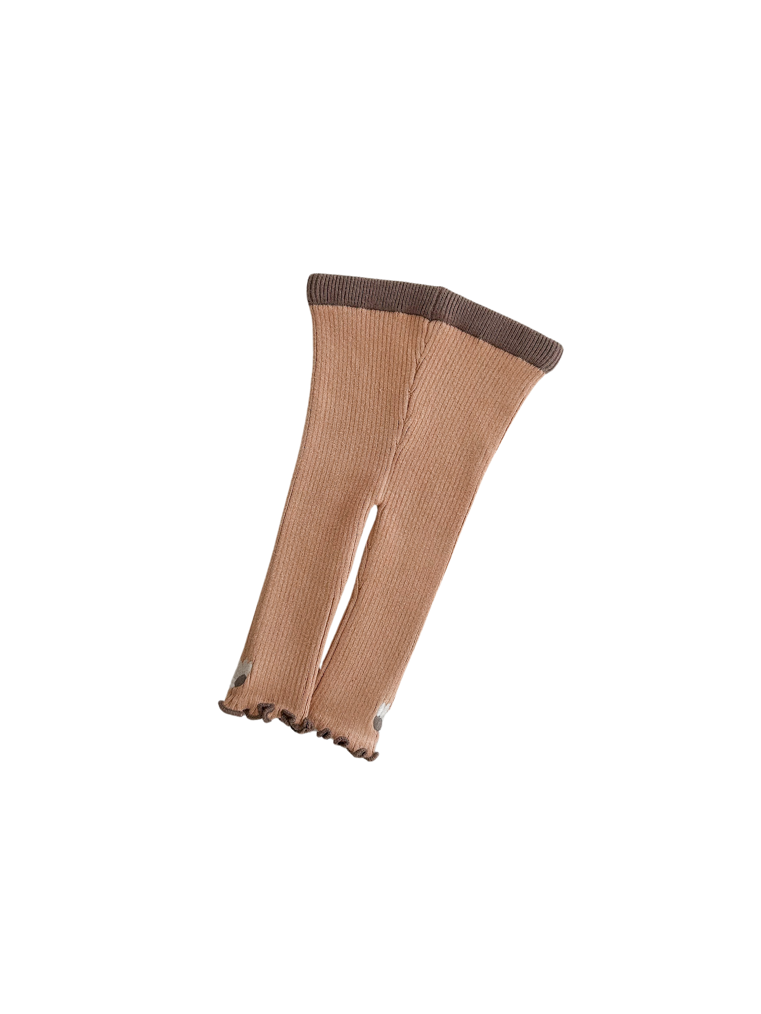 Knitted ribbed leggings in our Dulce colour, featuring an embroidered Hazel flower on each ankle. Mix and match with our Hazel + Cyrus Collections.