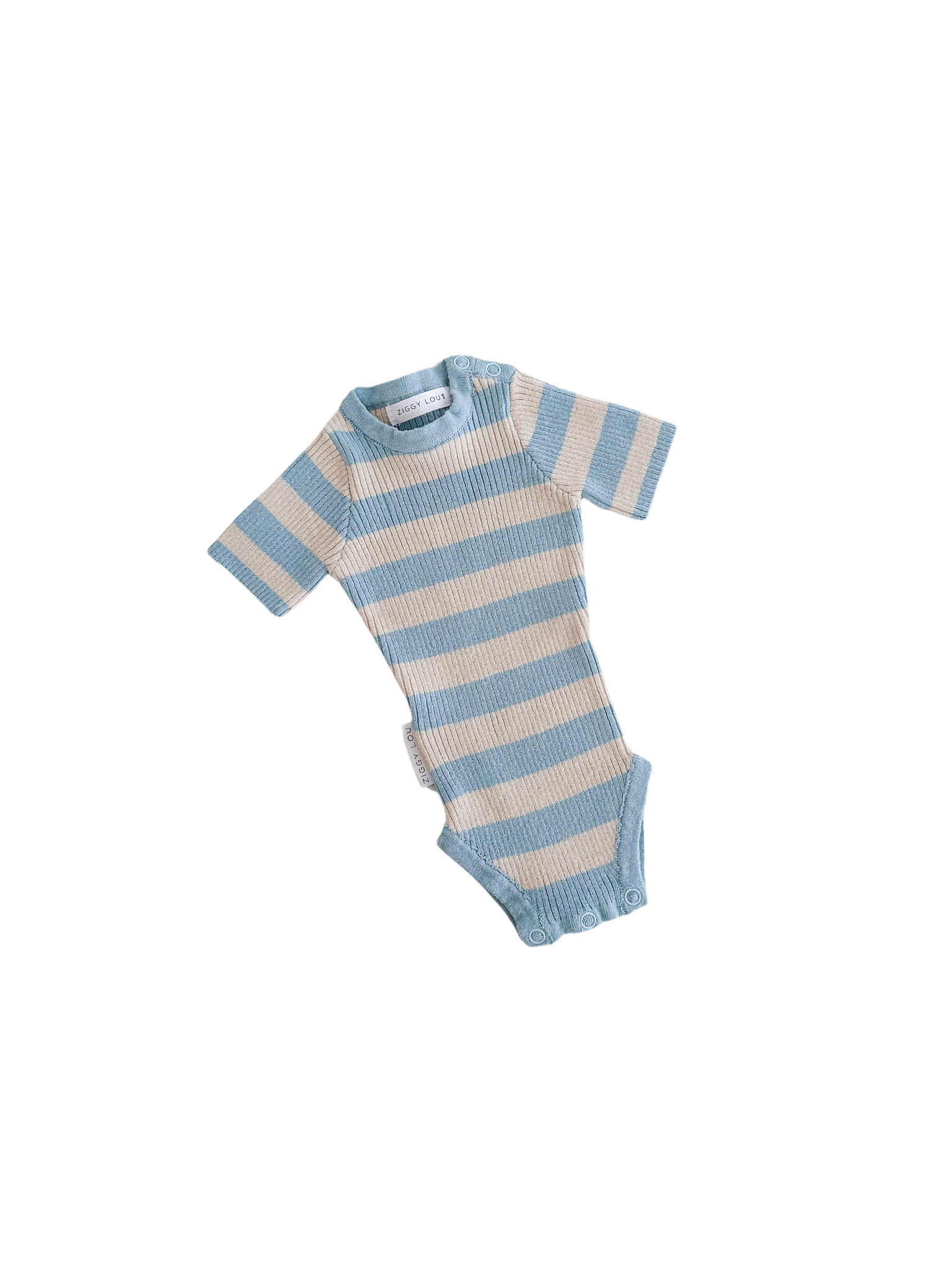 Ribbed short sleeve bodysuit featuring our Lake design. Functional press snaps at crotch for easy nappy changes and press snaps on shoulder for easy on/off. Mix and Match with items from our Costa + Lake Collections.
