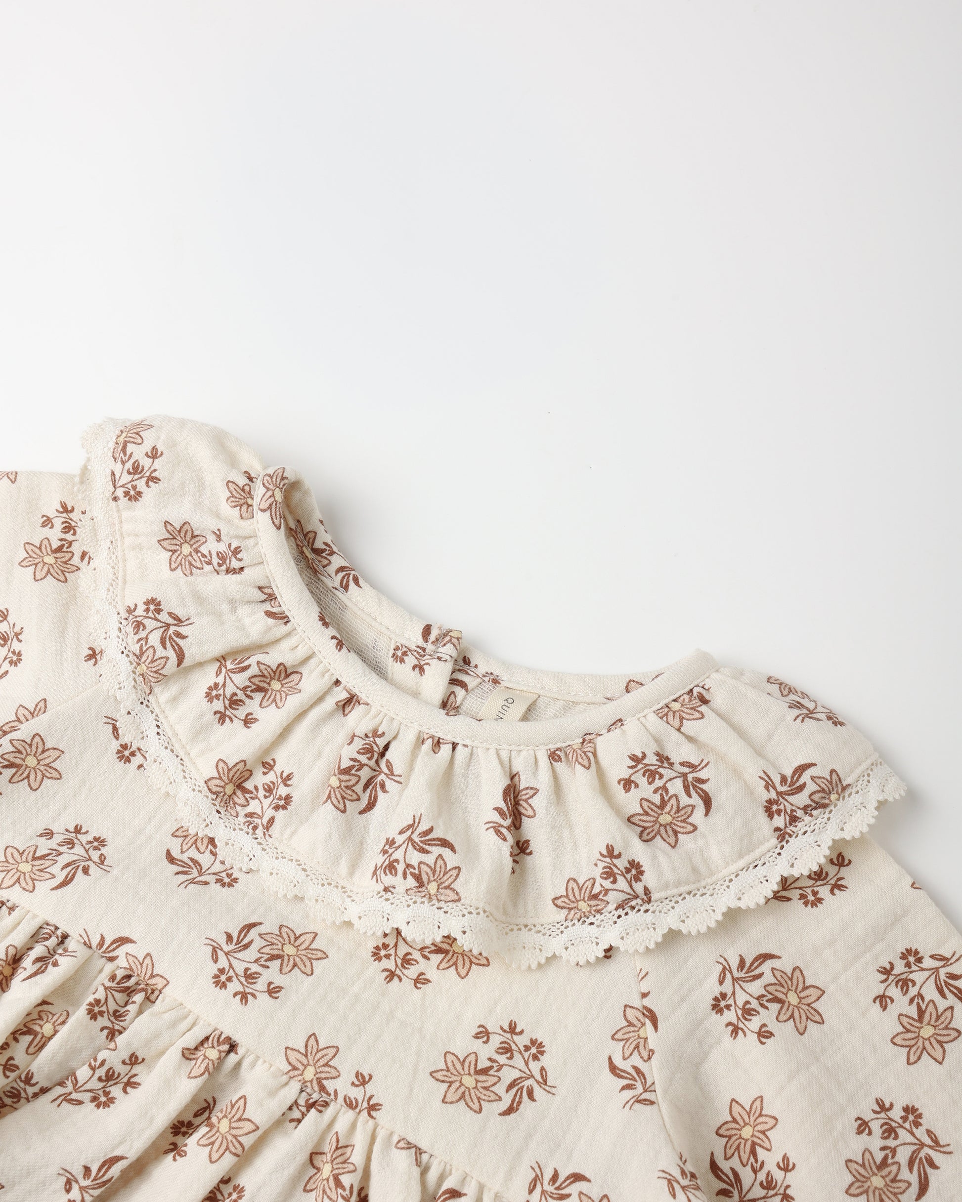 The Thalia Romper features a sweet collar, embroidered detail, a gathered waist, coconut buttons down the back, and bottom snaps for easy changes.