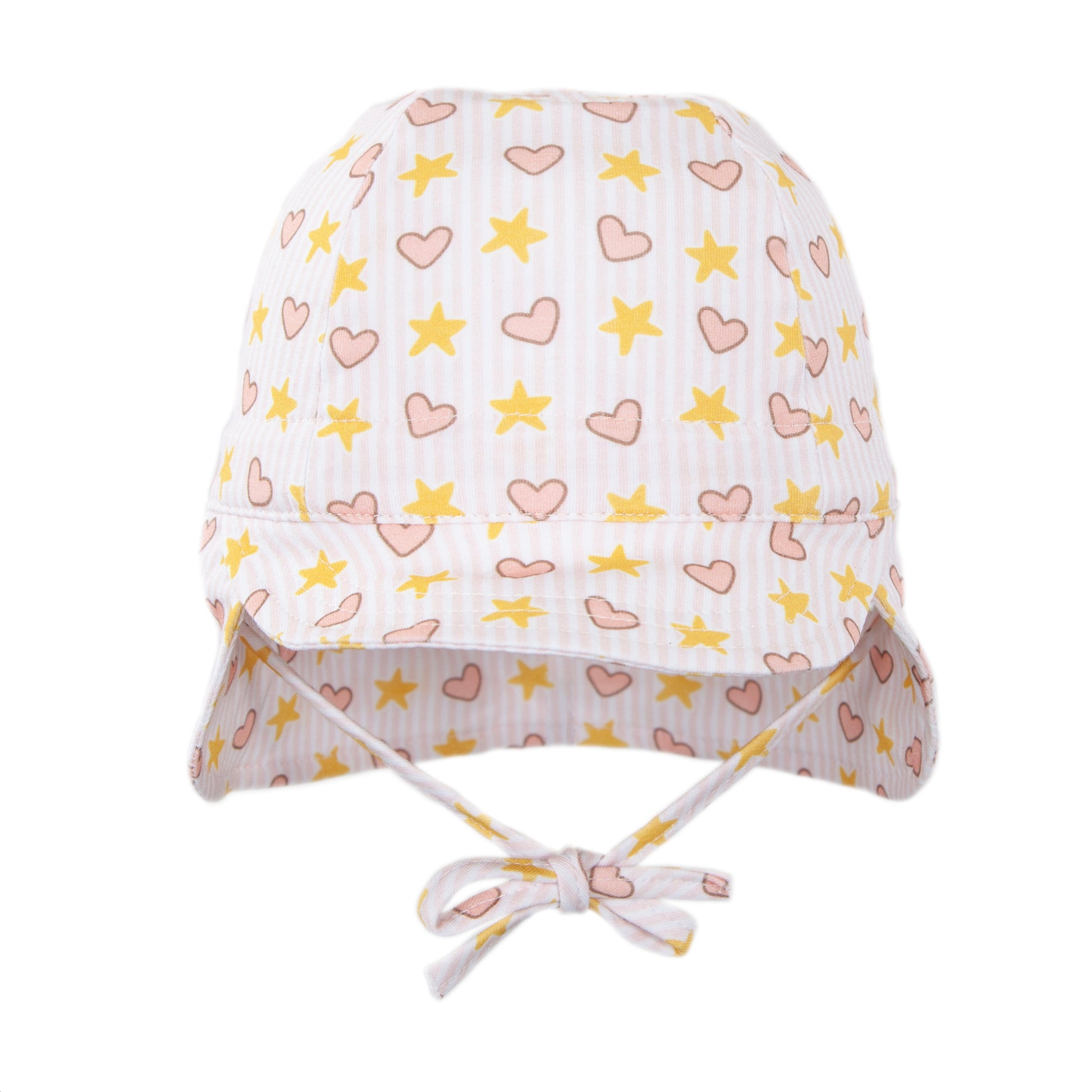 Flap cap hat with a pink striped base and fun stars and hearts print designed by Jacinta Weir from Two Little Ducklings.