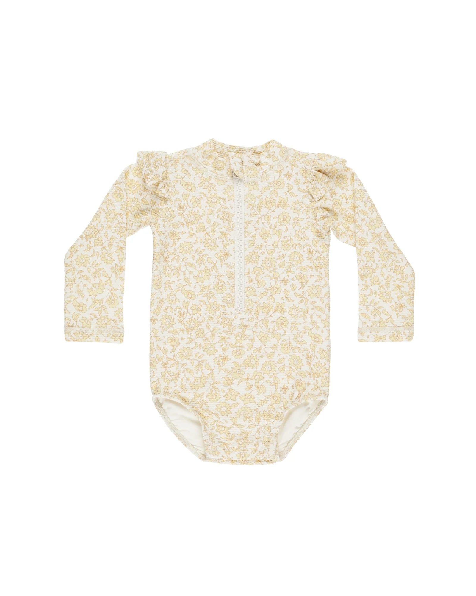 This one-piece rashguard swimsuit will have your little one protected from the sun in style. Featuring a front zipper closure and ruffle detail at the shoulders.