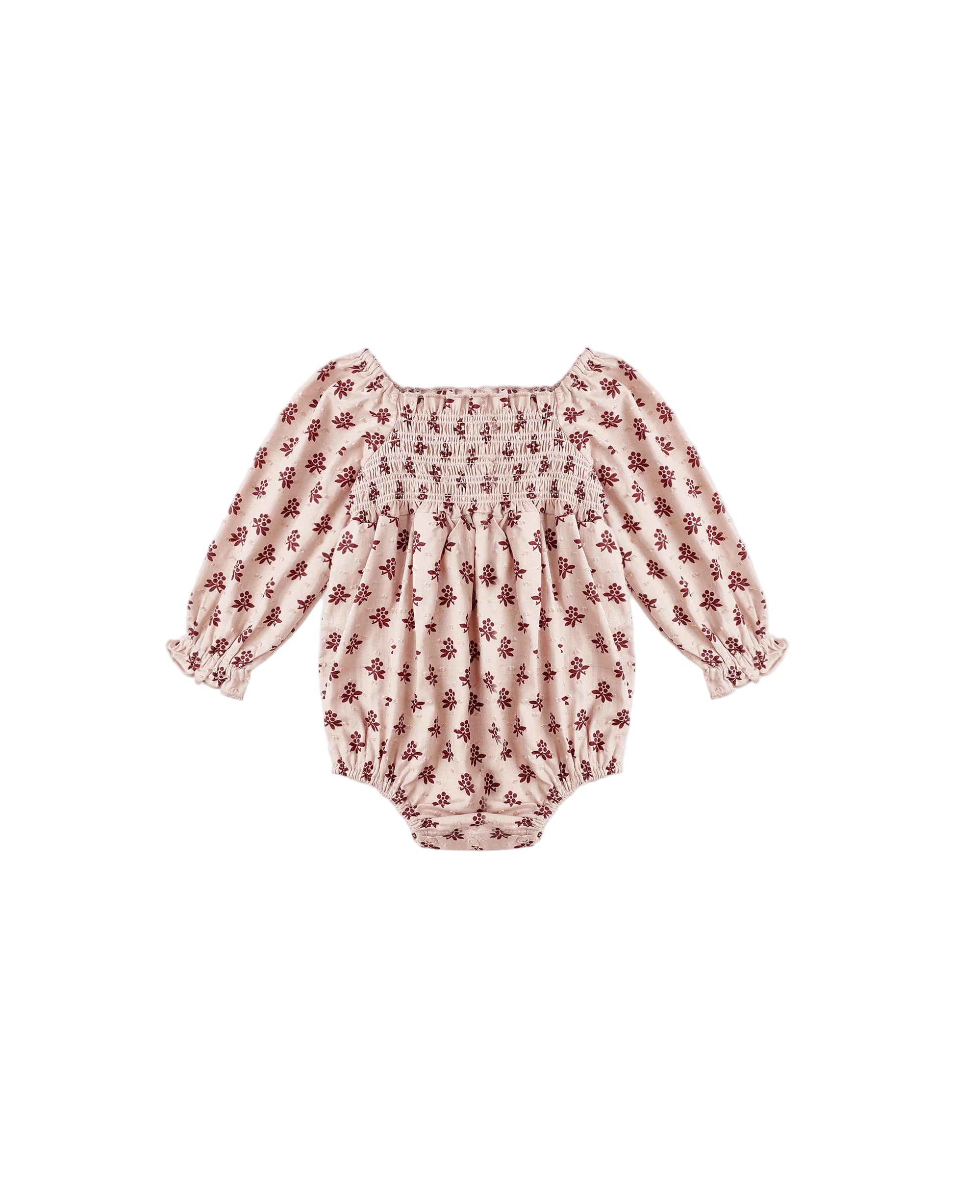 The Adelaide Romper features a delicate square neckline, smocked detailing at the front and back, long puffed sleeves, and convenient bottom snaps for easy changes.
