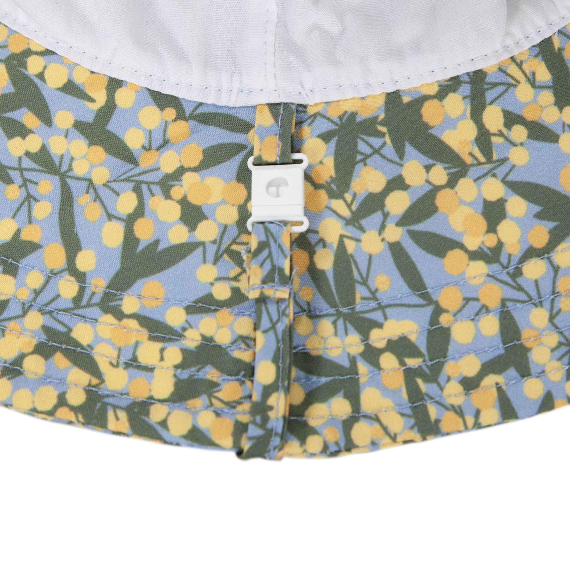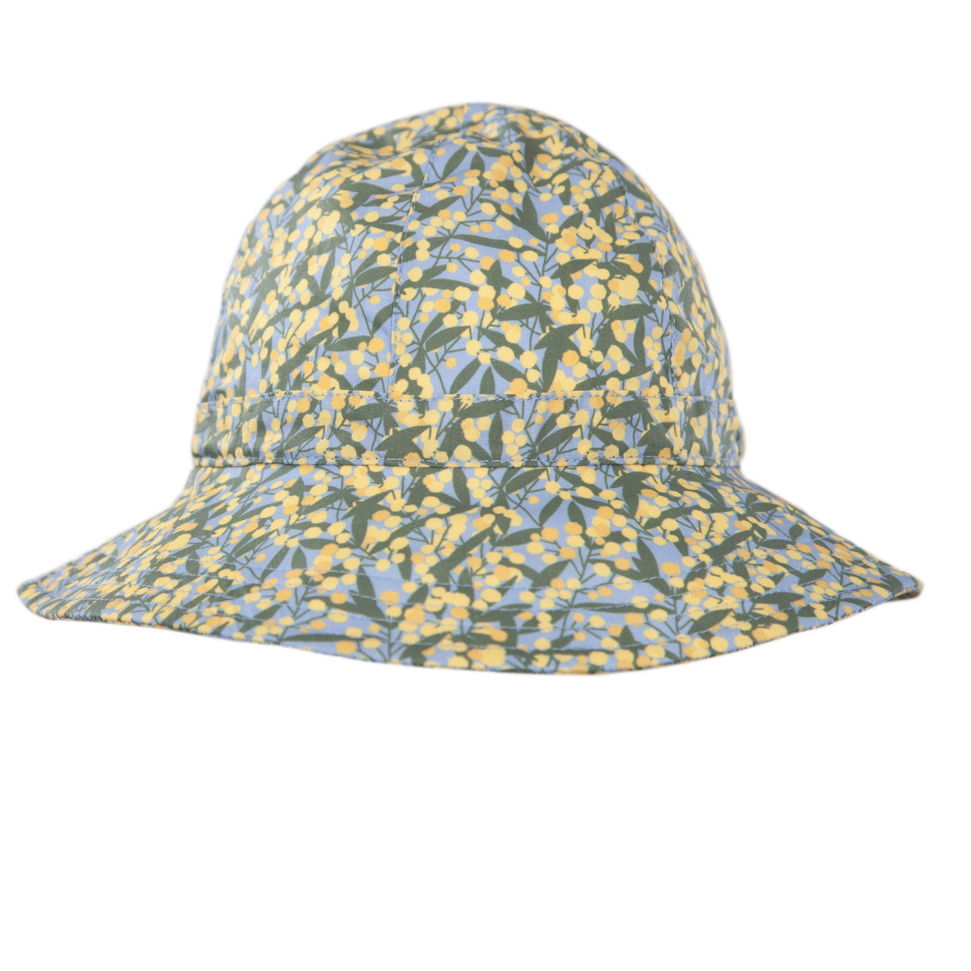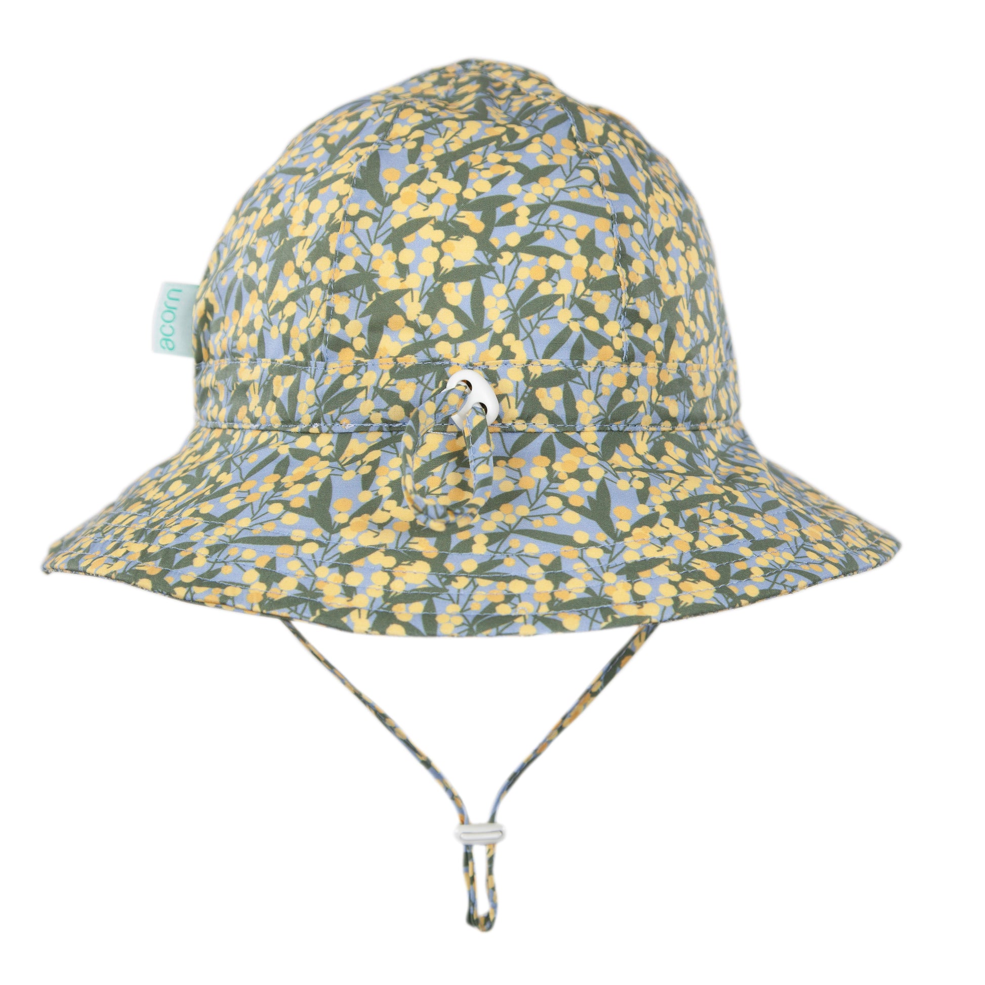 Keep little heads cool and sun-safe with this wide brim sunhat, featuring a gorgeous blue-based golden wattle print by Jacinta Weir from Two Little Ducklings on the outside and inner brim.
