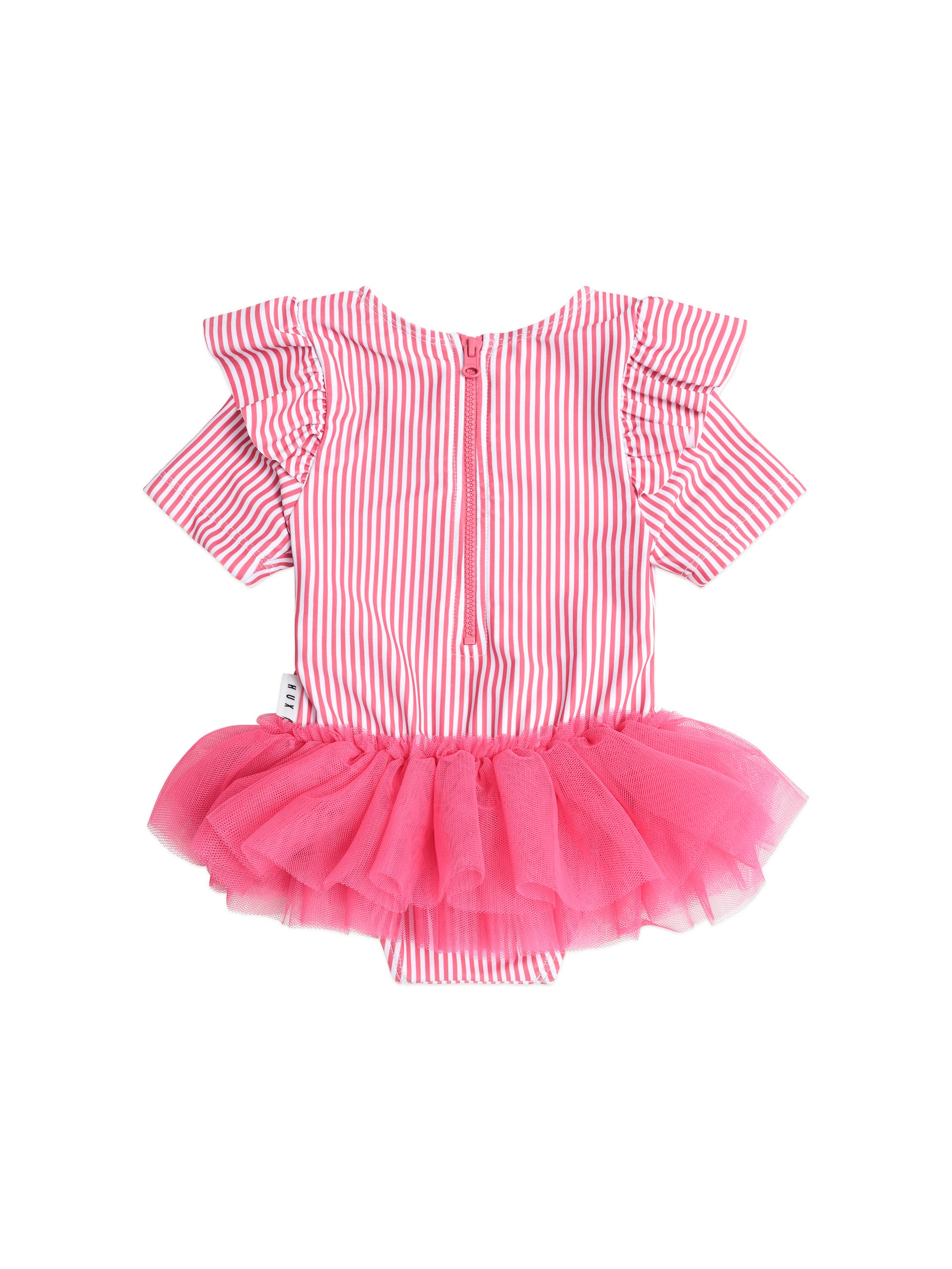 Getting ready for the beach is easy as in our zip up rashguard. This ballet style onesie is rated UPF 50+, which is the highest achievable sun protective rating for fabrics. Consciously crafted with recycled polyester, it features a zip for speedy changes, short sleeves for added protection and tutu skirt for underwater swirls.