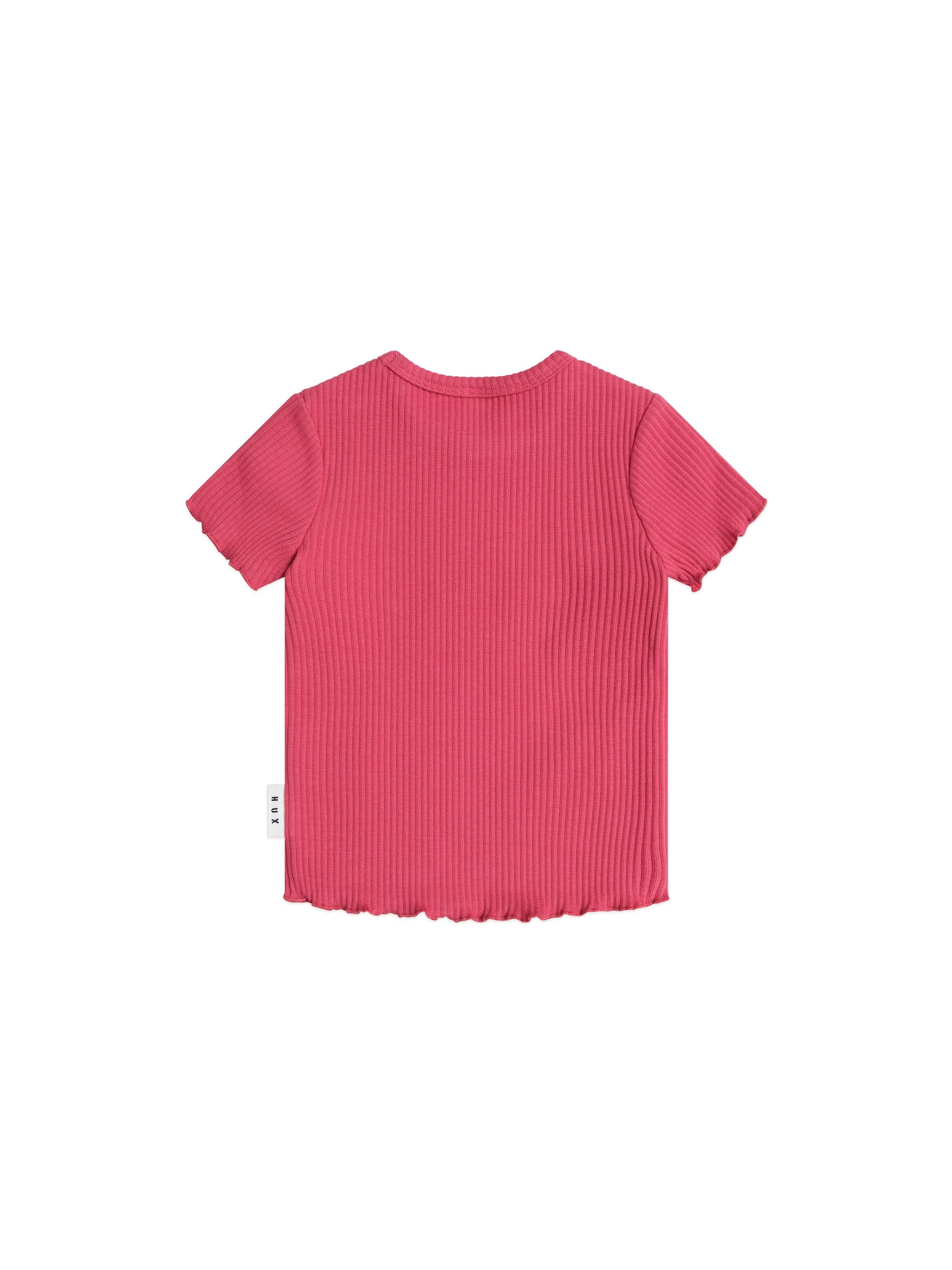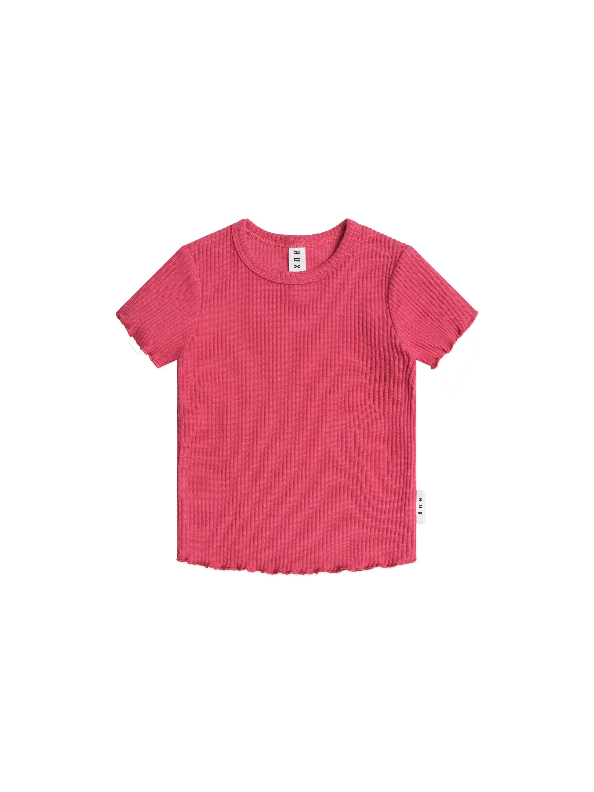 A versatile tee in cherry red. This short-sleeved top is made from extra thick ribbed cotton to keep little bodies warm and features a sweet lettuce edge detail to complete the look. A true wardrobe essential.