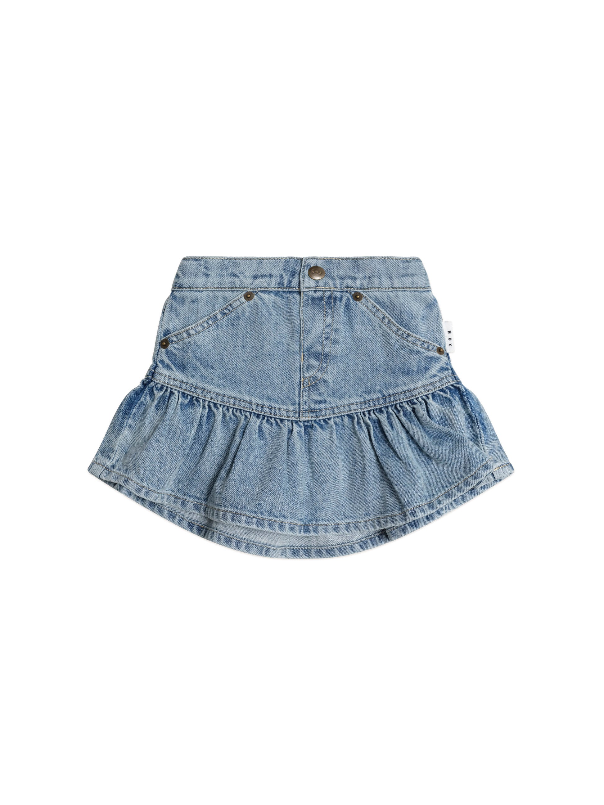 The kind of skirt they’ll want to wear again and again. This 90s style mini is made from deliciously dreamy denim in in quintessential blue. It features a stretchy waistband, side and back pockets and a pretty frill flare hem.
