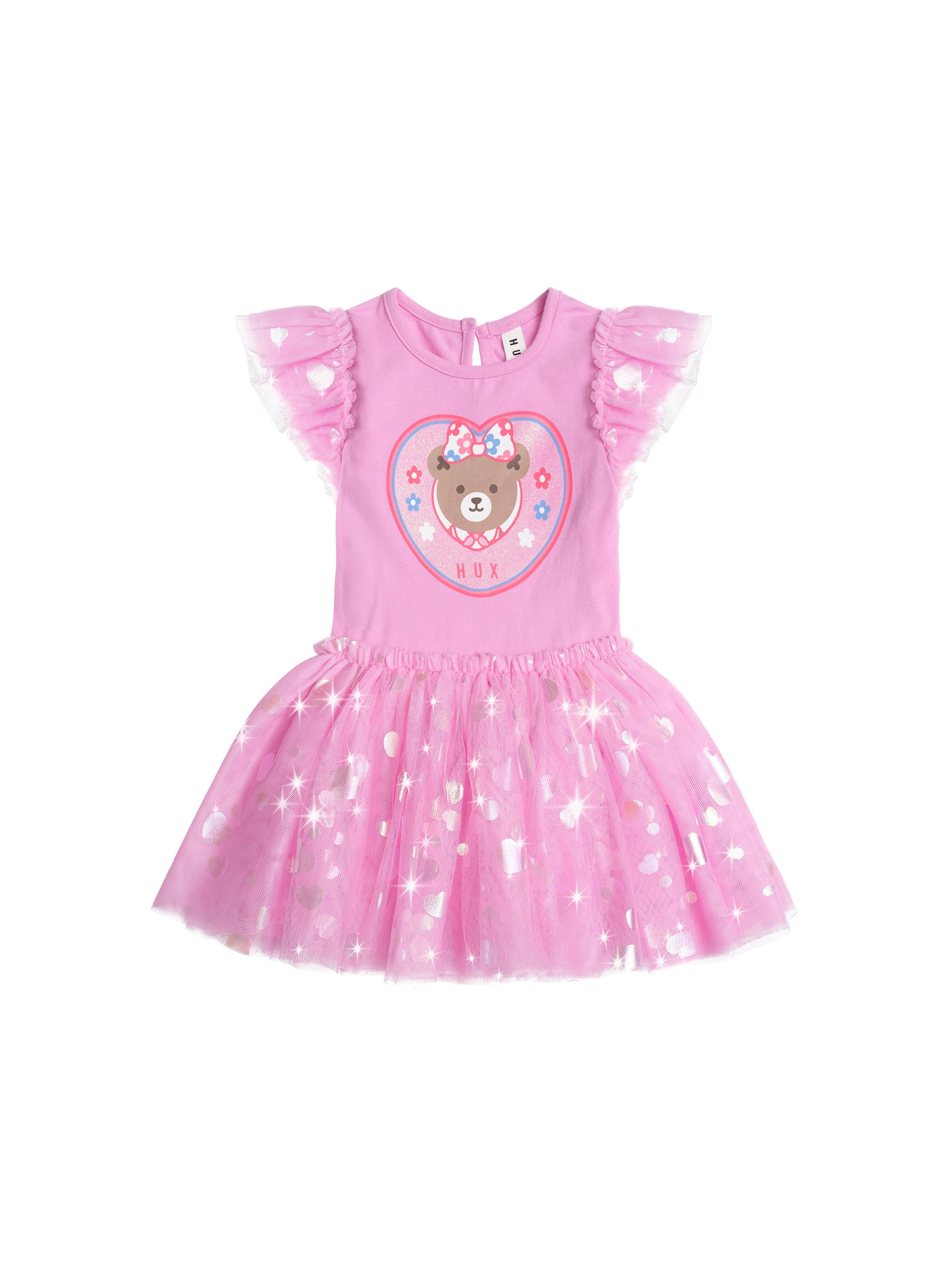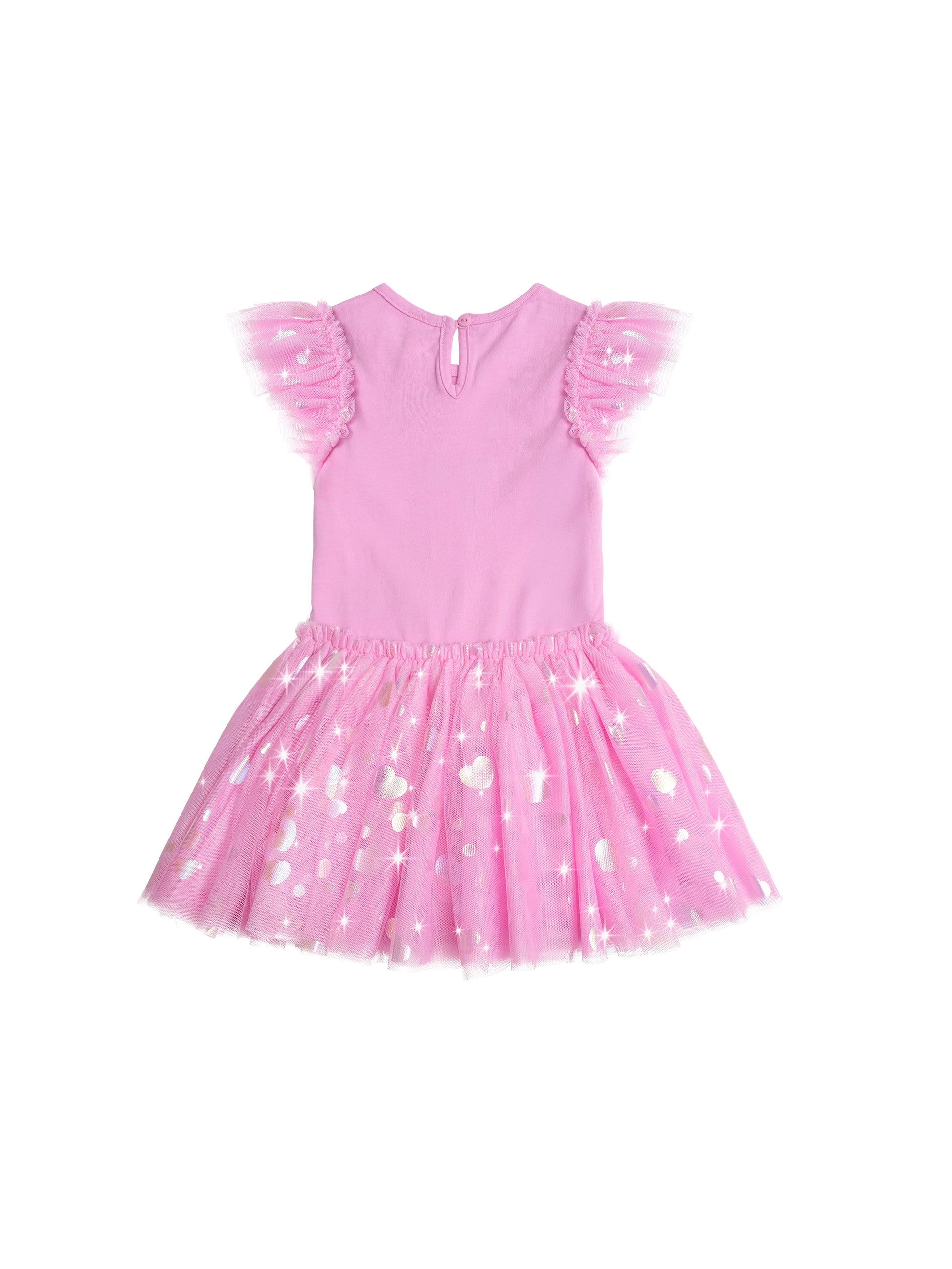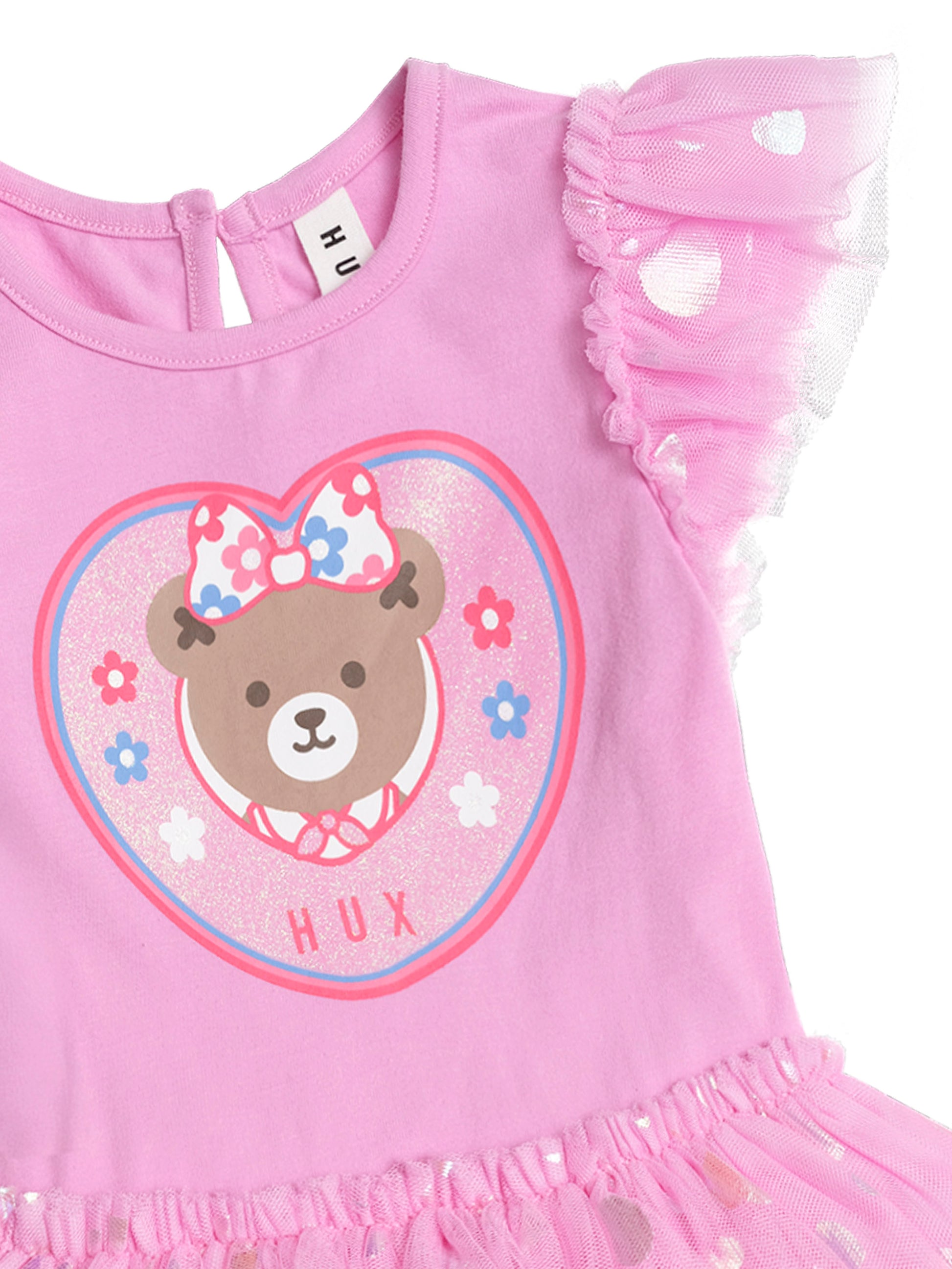 Party princess approved. This short sleeve cotton dress is a little girl’s dream, with tulle shoulder frills, a sparkly ballet skirt and a Huxette glitter print on the chest. It has a button keyhole closure at the neck.