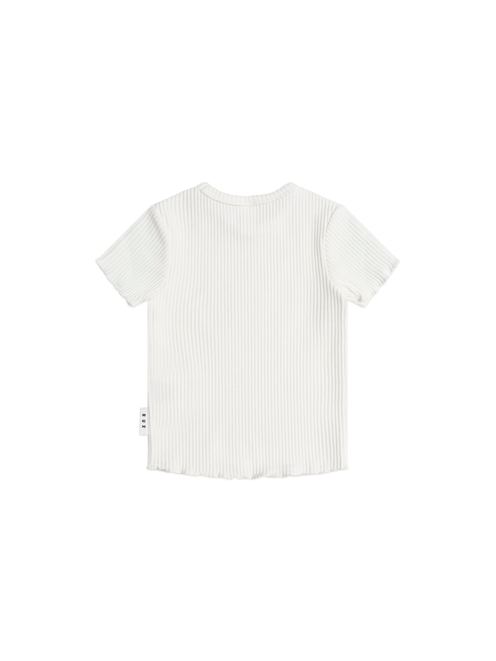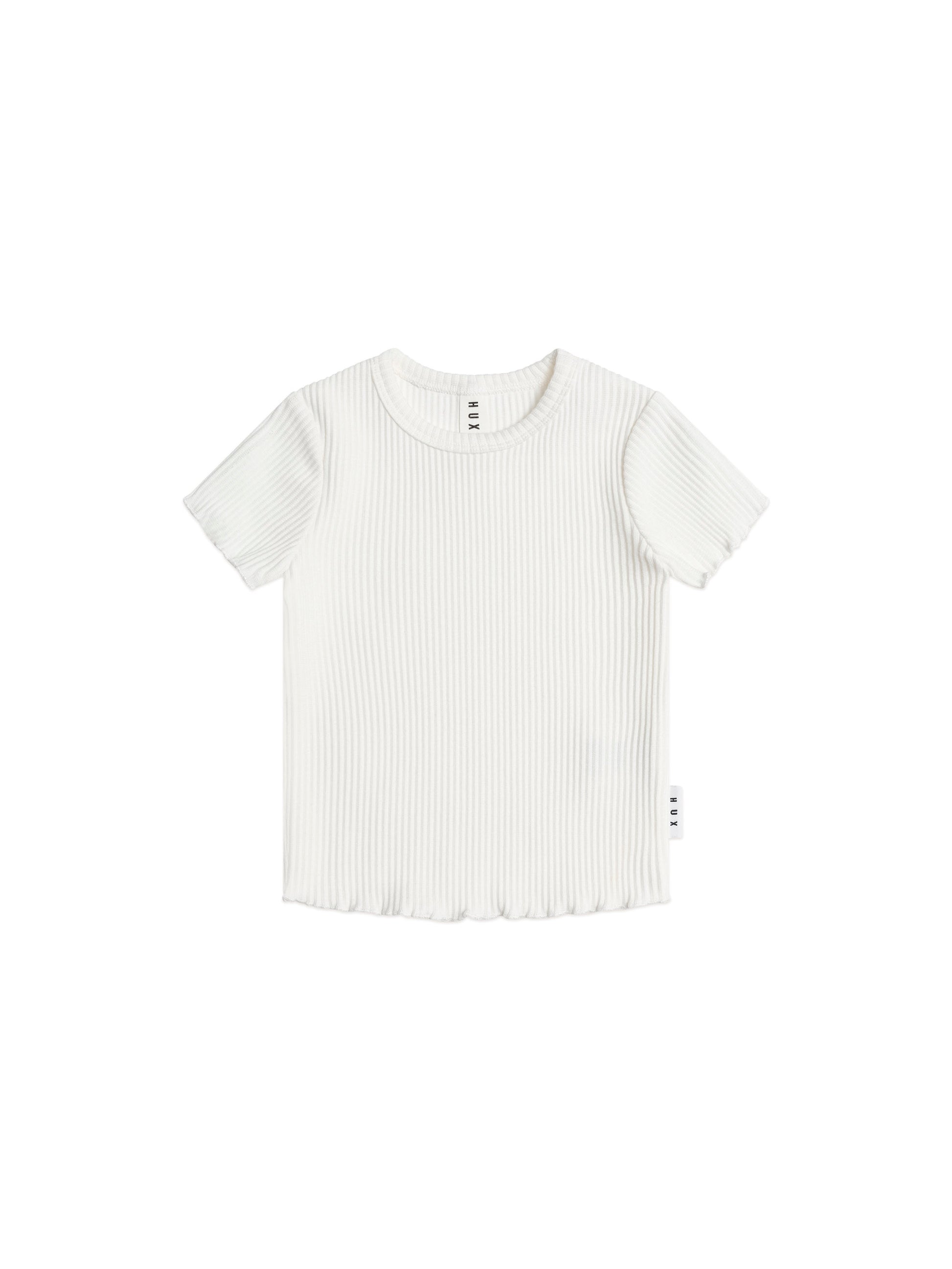A versatile tee in milky white. This short-sleeved top is made from extra thick ribbed cotton to keep little bodies warm and features a sweet lettuce edge detail to complete the look. A true wardrobe essential.