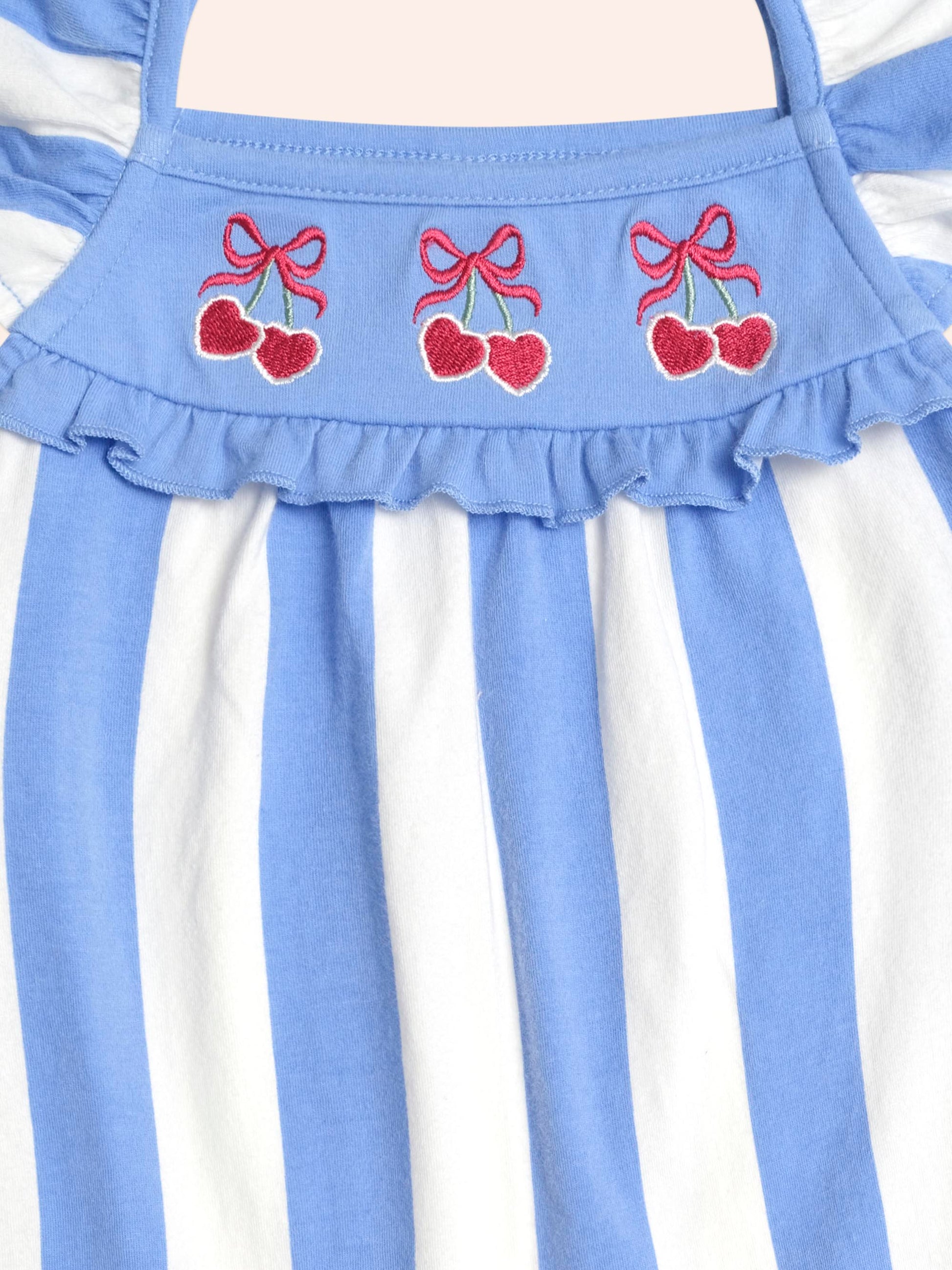 The sweetest summer dress you’ve ever seen. Made from buttery soft organic cotton in seaside stripes, it features sweet shoulder ruffles, embroidered cherry details and tiered ruffle.