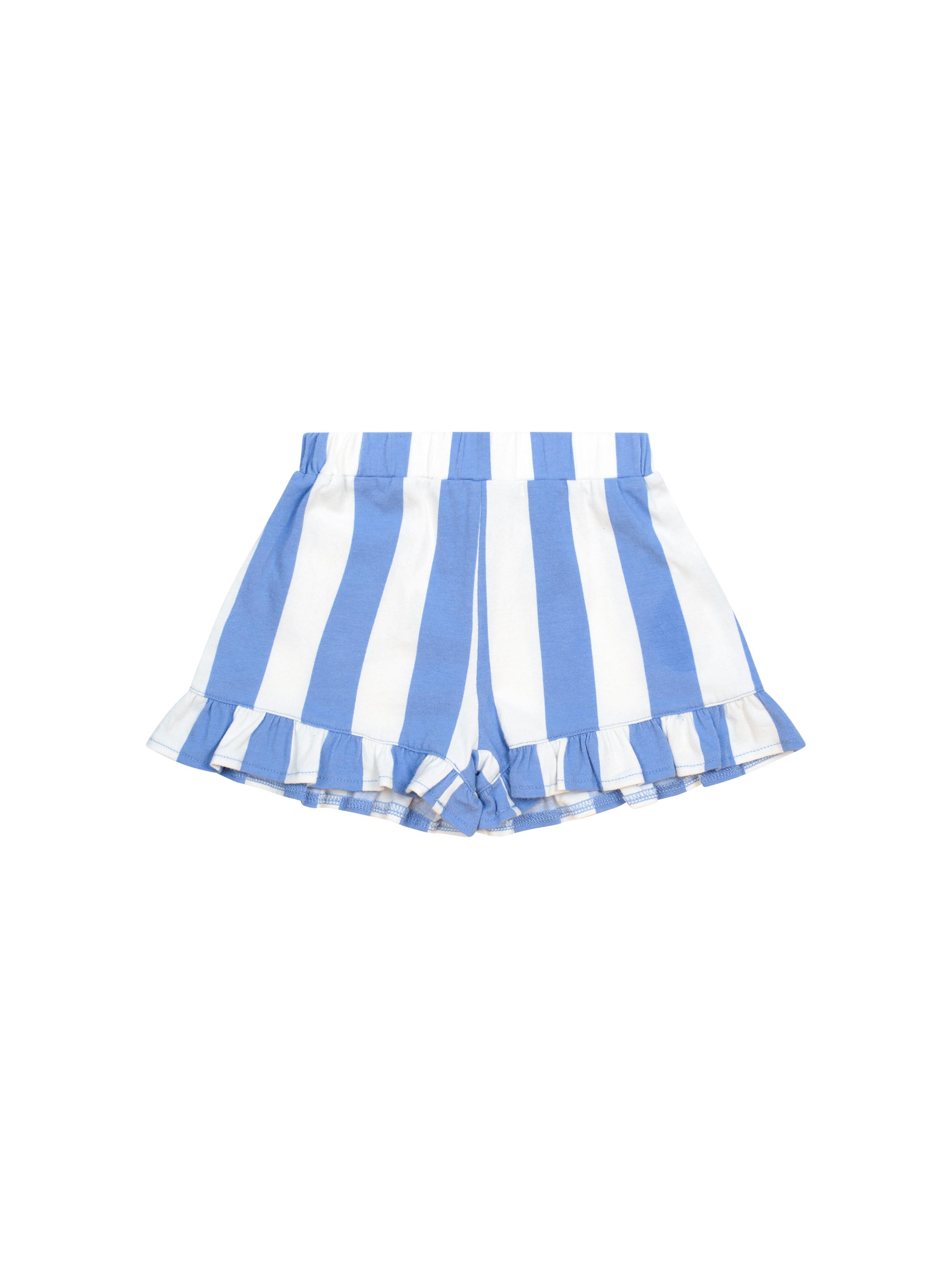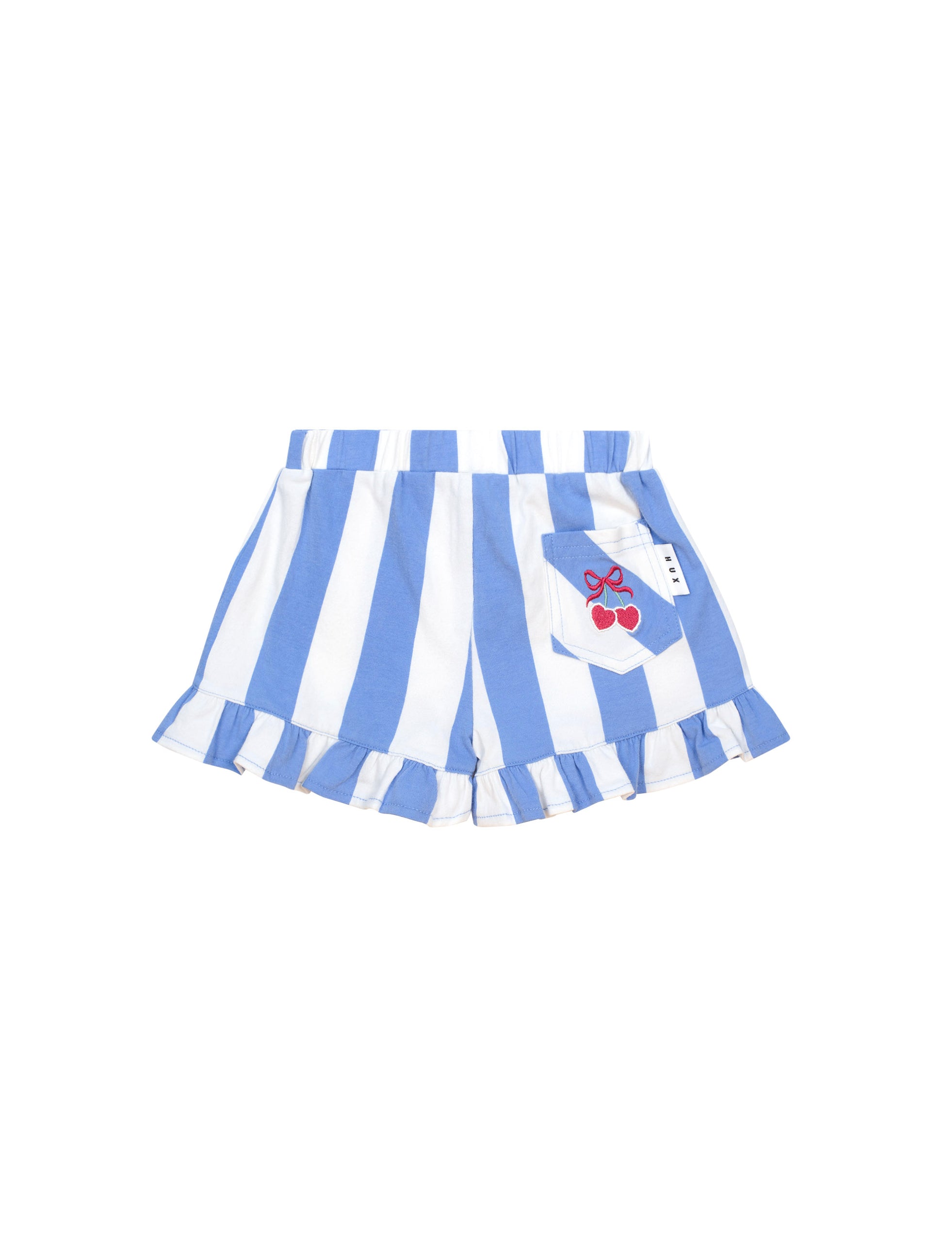 The prettiest shorts you ever did see. These seaside stripe shorties are made from soft organic cotton and feature a stretchy waistband, frill leg detail and an embroidered cherry detail on back pocket.