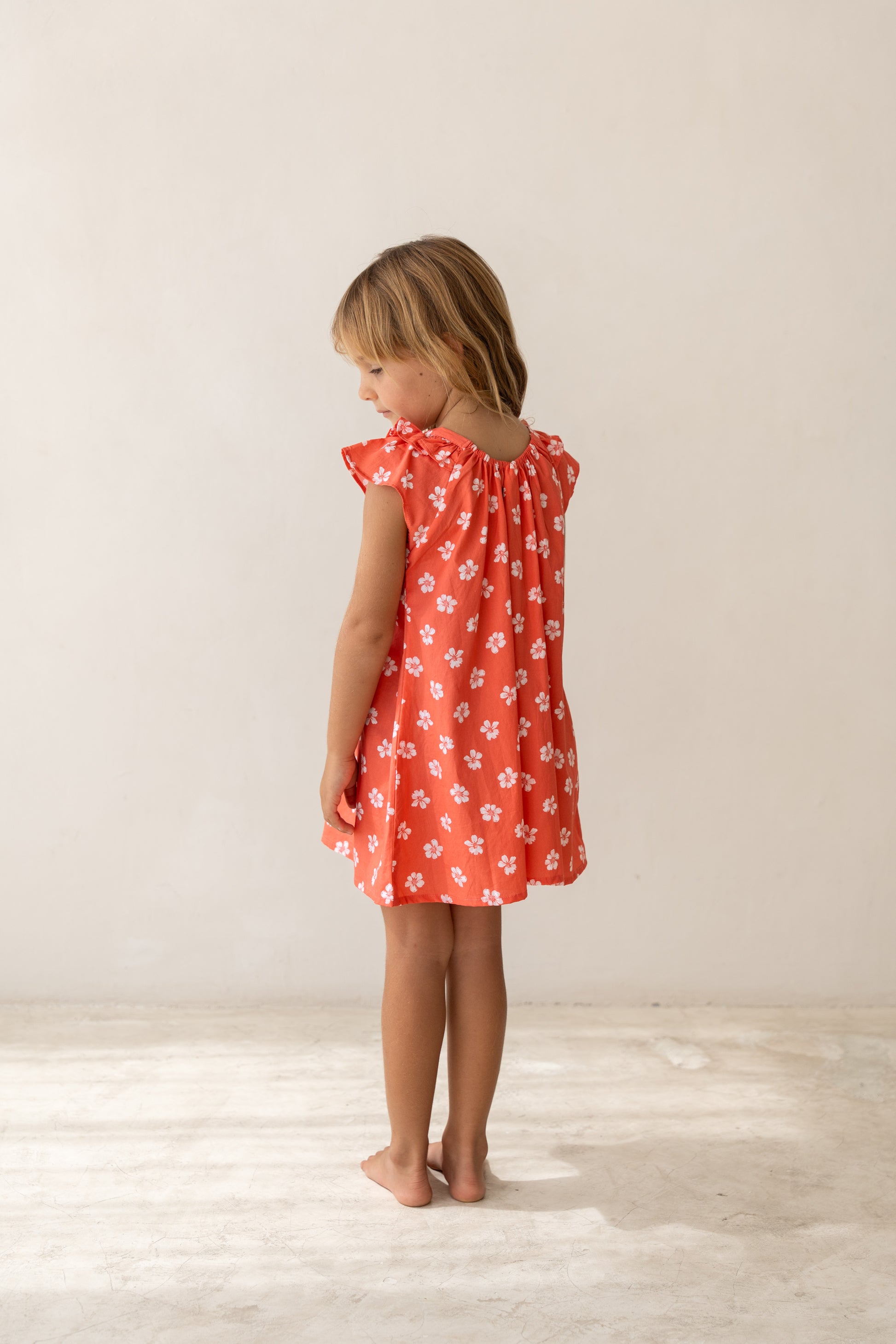 The Opie Dress returns in our Summer Floral Print — a vibrant coral scattered with delicate