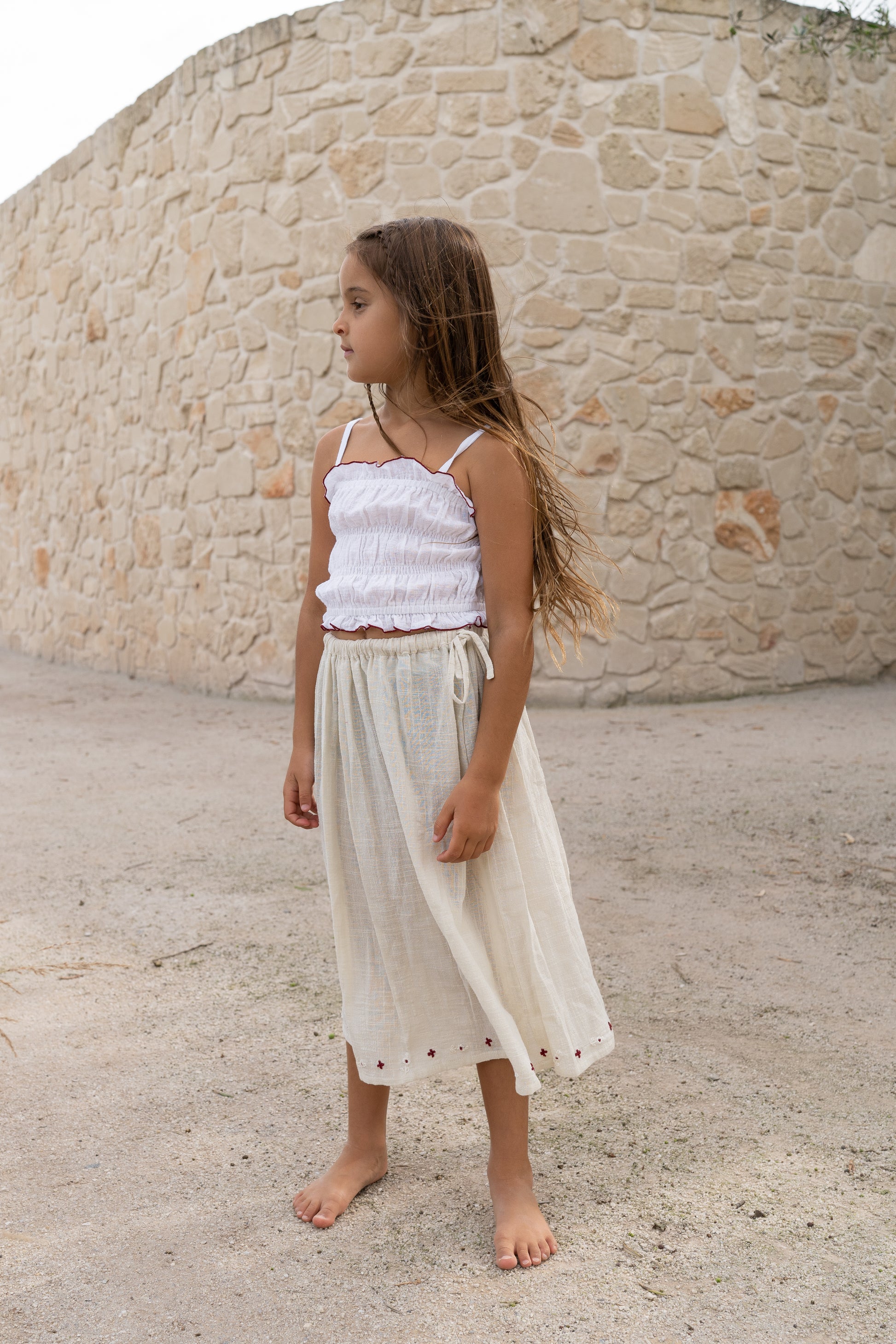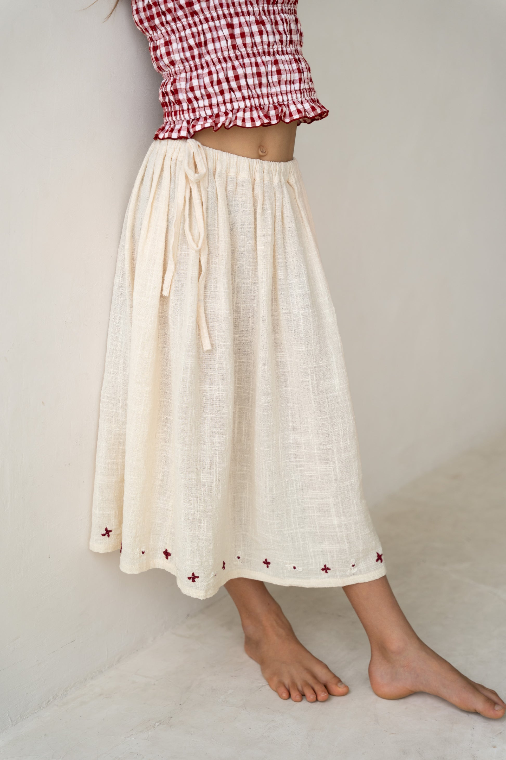 Returning for their favourites collection and brimming with femininity, the Posie Skirt from Illoura The Label is made sweeter by the contrast, hand-embroidered floral trim. Crafted from a Natural hue 100% cotton, this style offers an elasticated waistband with a functional drawcord - we love this paired with the Shirred Crop in the beautiful red gingham print.