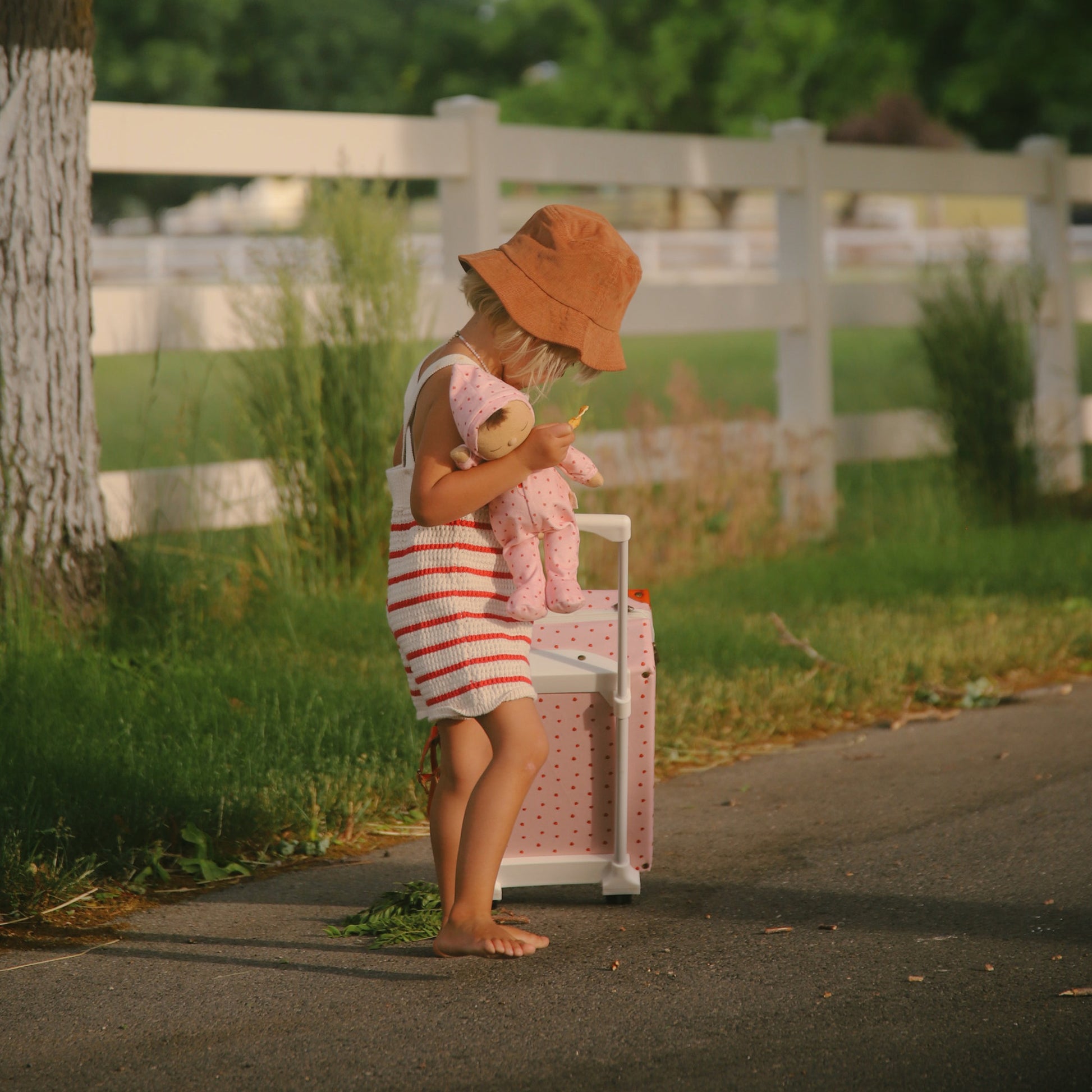 The signature See-Ya Suitcase in Strawberry from Olli Ella gives kiddos independence on road trips and sleepovers and makes a unique storage solution for kids at home. A zipped compartment and clothing clip keep belongings snug, safe and sound. An elastic outer strap makes an ideal spot to stow an extra toy – like a Cozy Dinkum. Every adventure begins with a See-Ya Suitcase!