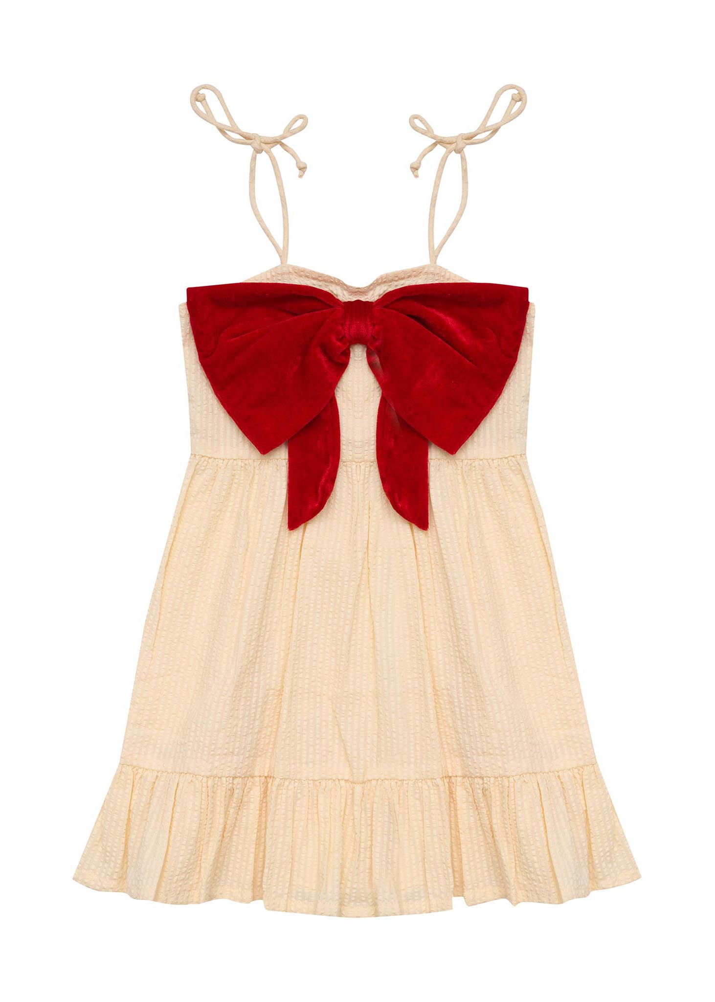 This charming Dasher dress is designed with a playful yet classic aesthetic. Made from Seersucker fabric that has a light and airy feel. It features thin shoulder straps that tie into dainty bows, adding a sweet adjustable detail.