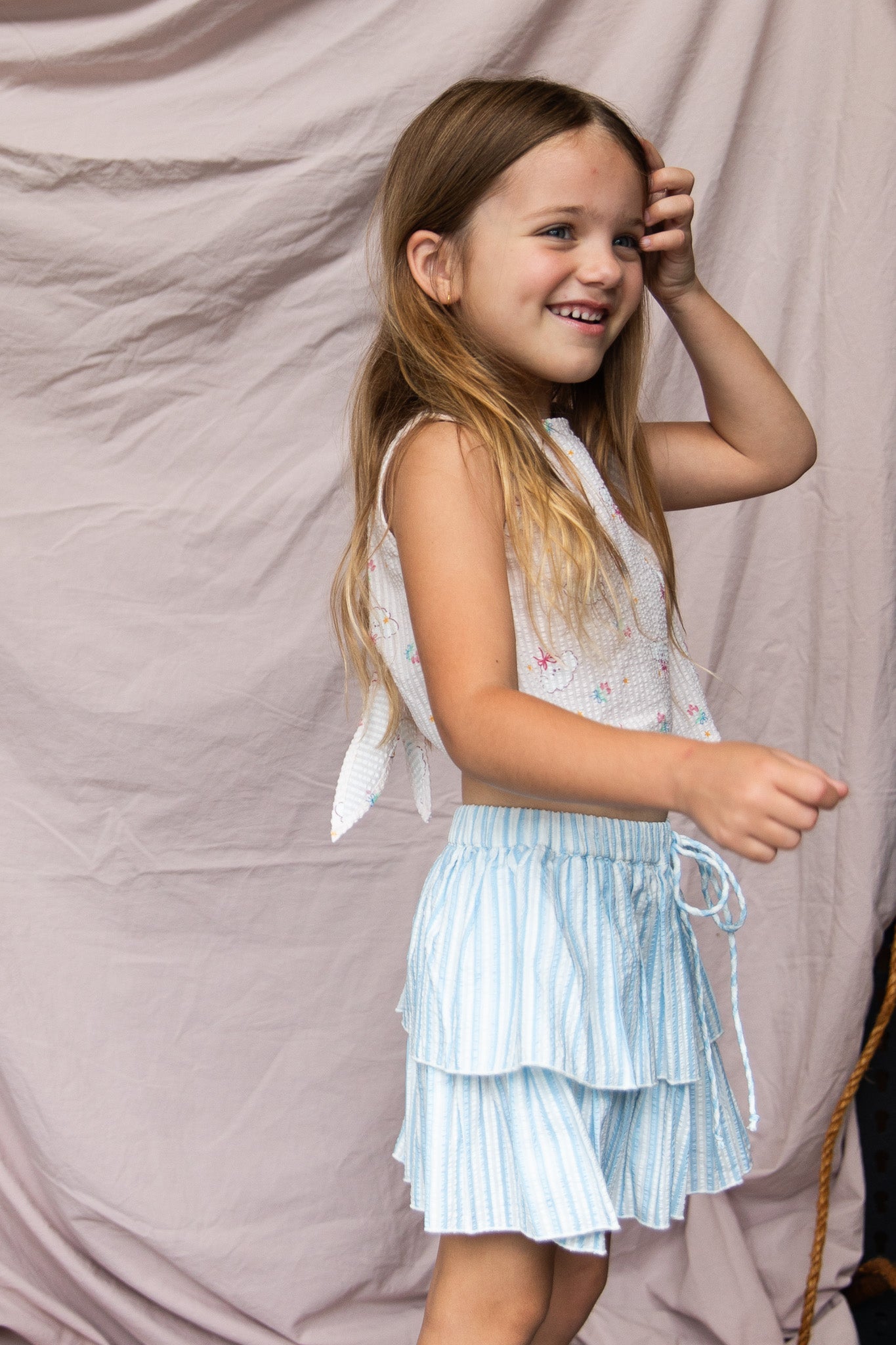 These shorts have all the charm of a skirt, amplified by double ruffle layers. The elasticated waist guarantees a comfy fit, while the Stripe print on soft, lightweight seersucker feels cool and airy. Pair them with the Georgie Top, Kate T-shirt or Millie Leotard for an effortlessly stylish outfit.