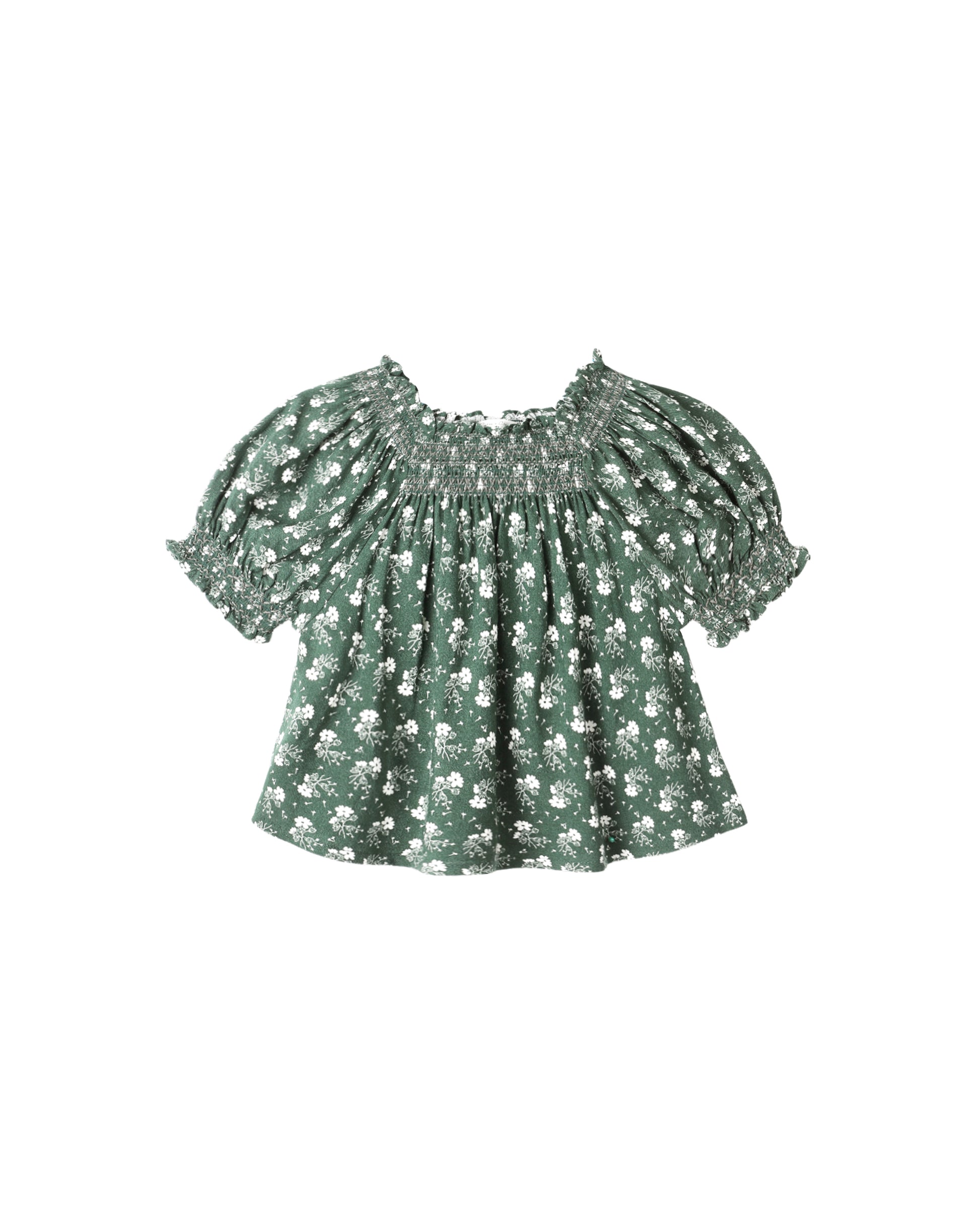 The Ada Blouse is a darling smocked top featuring balloon ruffle sleeves and a soft A-line silhouette for a sweet, feminine look.