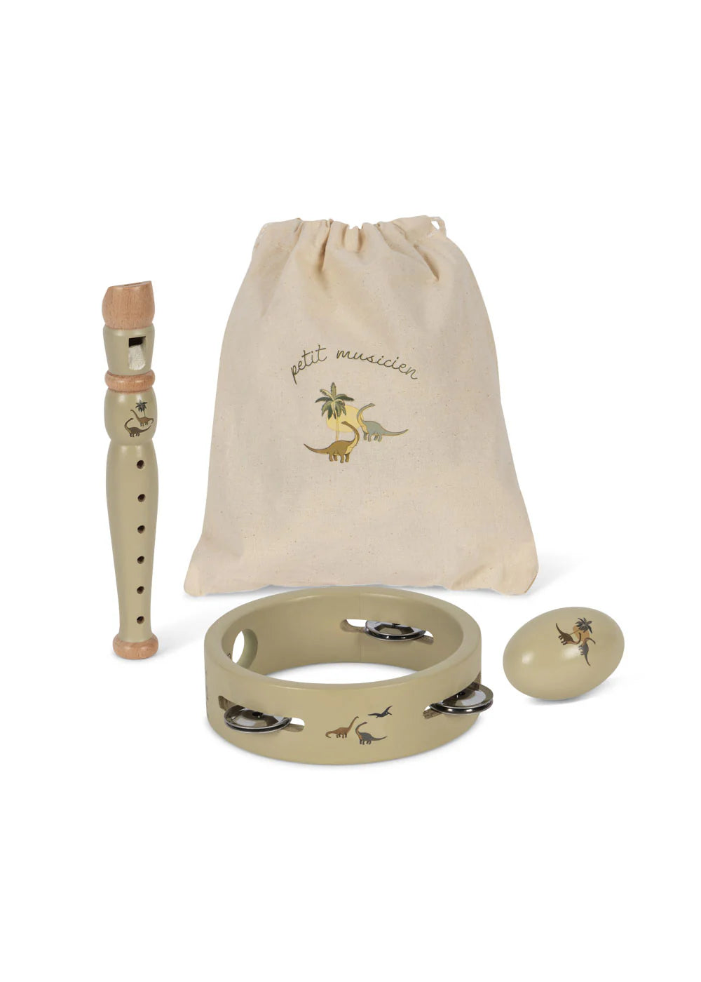 Unleash your child's inner rockstar with the Konges Sløjd Wooden Music Set Dino! This set of instruments includes a rattle, an egg, and a flute, all made from sustainable FSC™-certified beech wood. Comes in a convenient drawstring cotton bag. Let the musical journey begin!