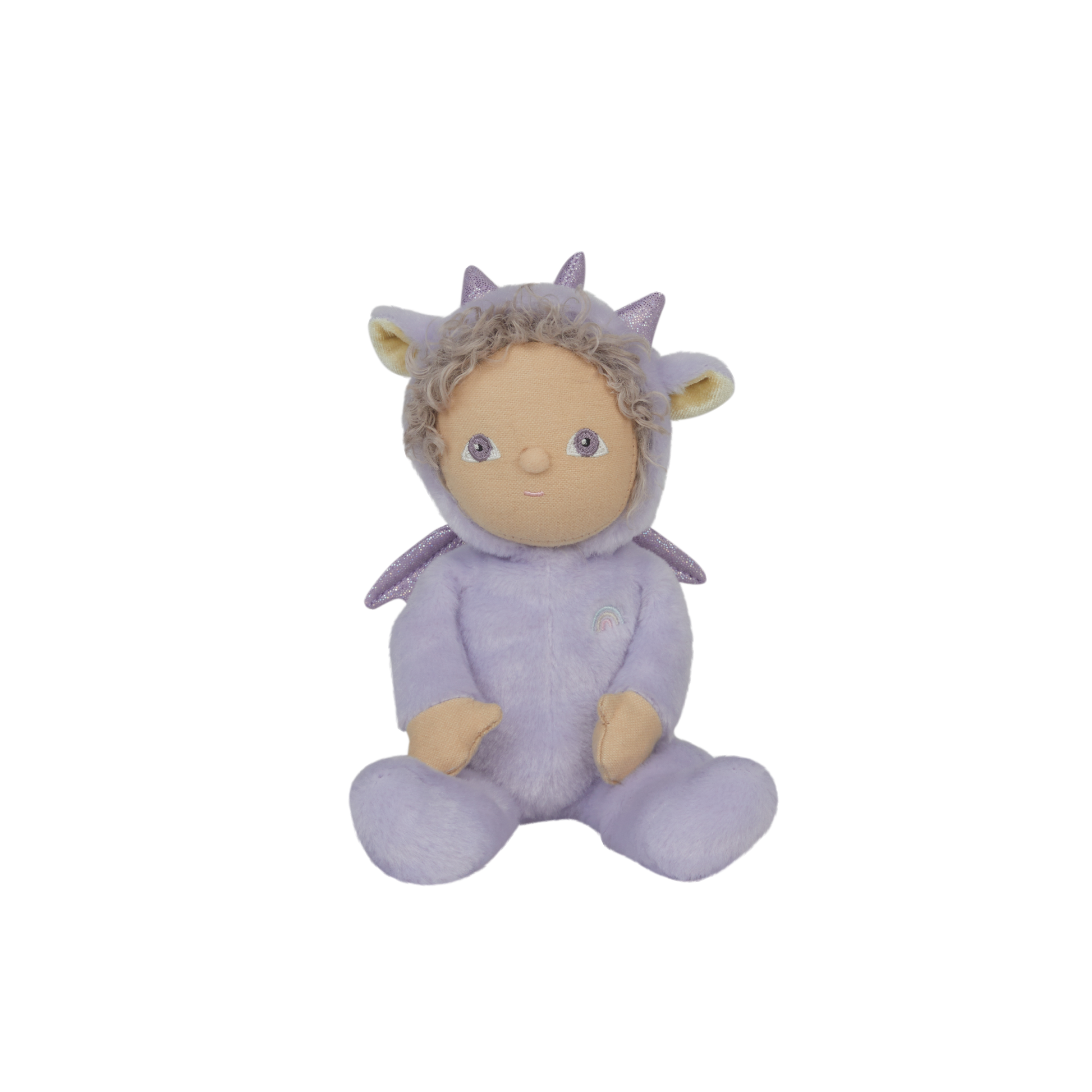 - Soft and cuddly, snuggled in a non-removable dragon onesie with iridescent wings and horns.
