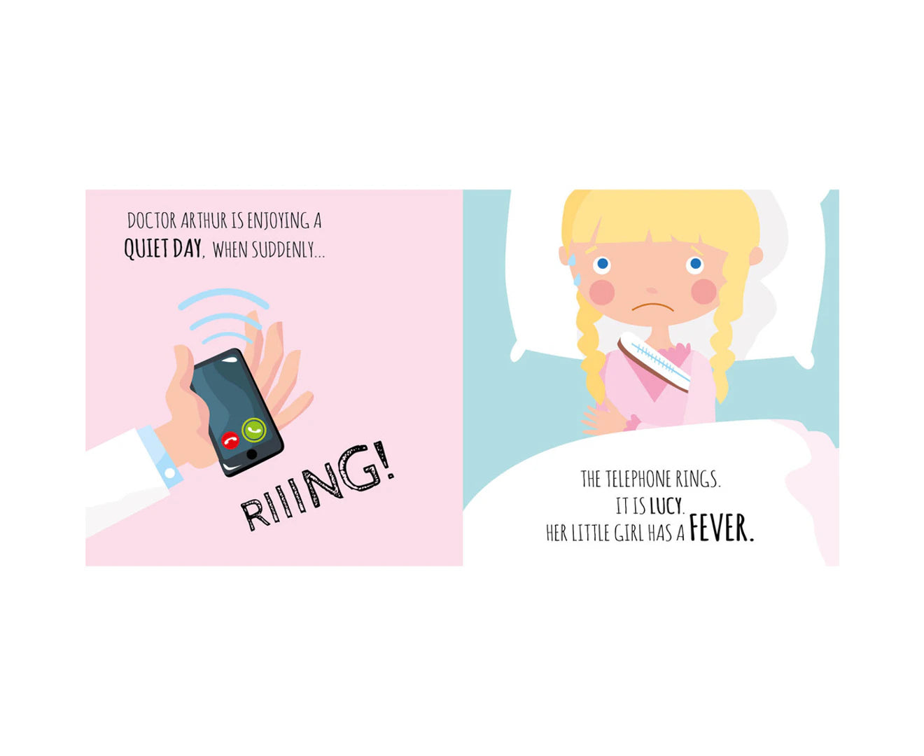 Doctor Arthur is a bit absent-minded: he’s always misplacing things in his office, and he often trips. When mum Lucy calls him because her daughter has a fever, the doctor races to see his patient—and slips and falls on the stairs. His medical instruments