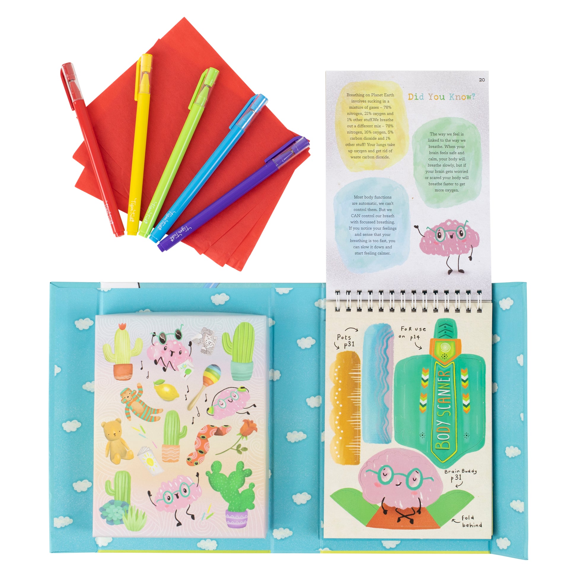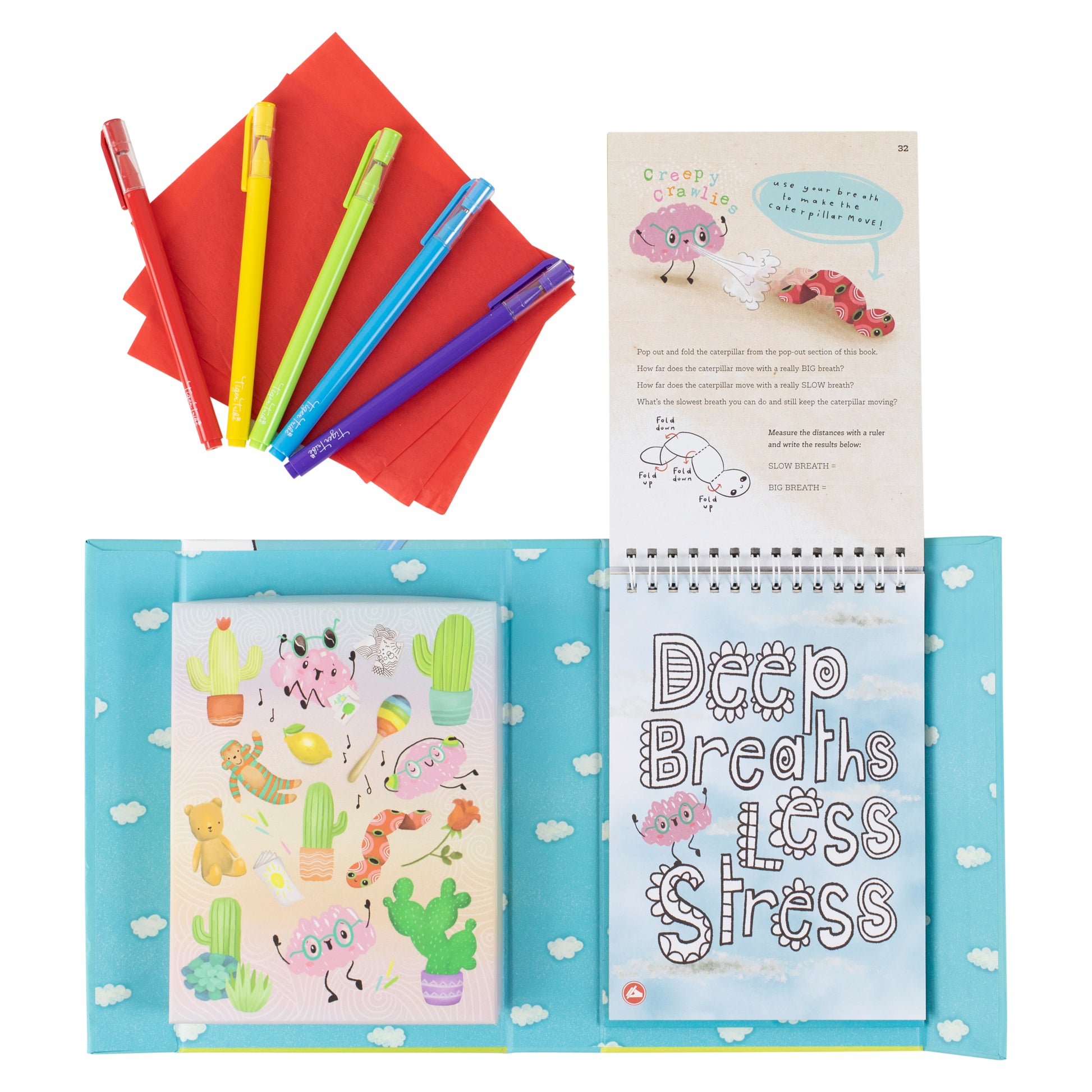 - Each set includes 45 page mindfulness guide book; 5x coloured gel pens, 3x sheets red tissue paper, 5x pop out activity pages, 2x sticker sheets