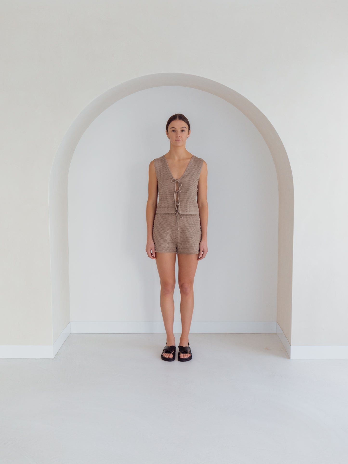 Women's eyelet knit shorts in our Milo colour. Functional drawstring and soft elastic waist for the perfect fit. Mix and match with items from our Milo Women's Summer Collection.