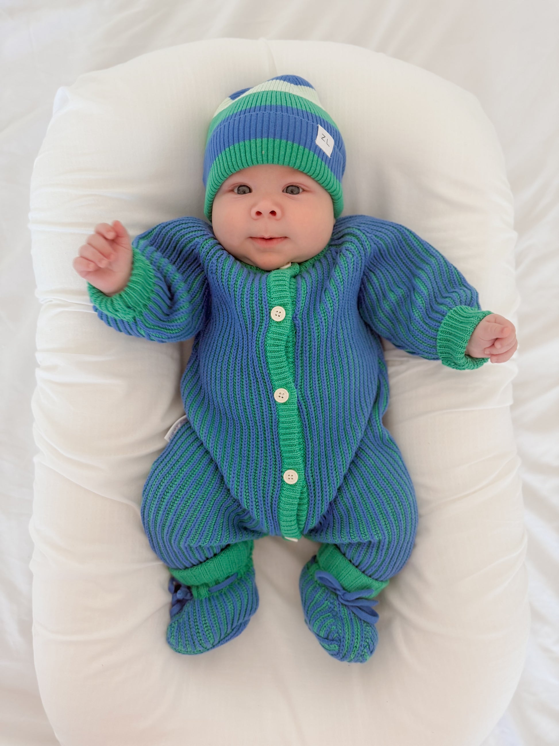 Knitted two tone booties to compliment our Aspen, Olly, Ace, Enzo + Otto Collections. Functional drawstring to ensure booties don't fall off when worn.