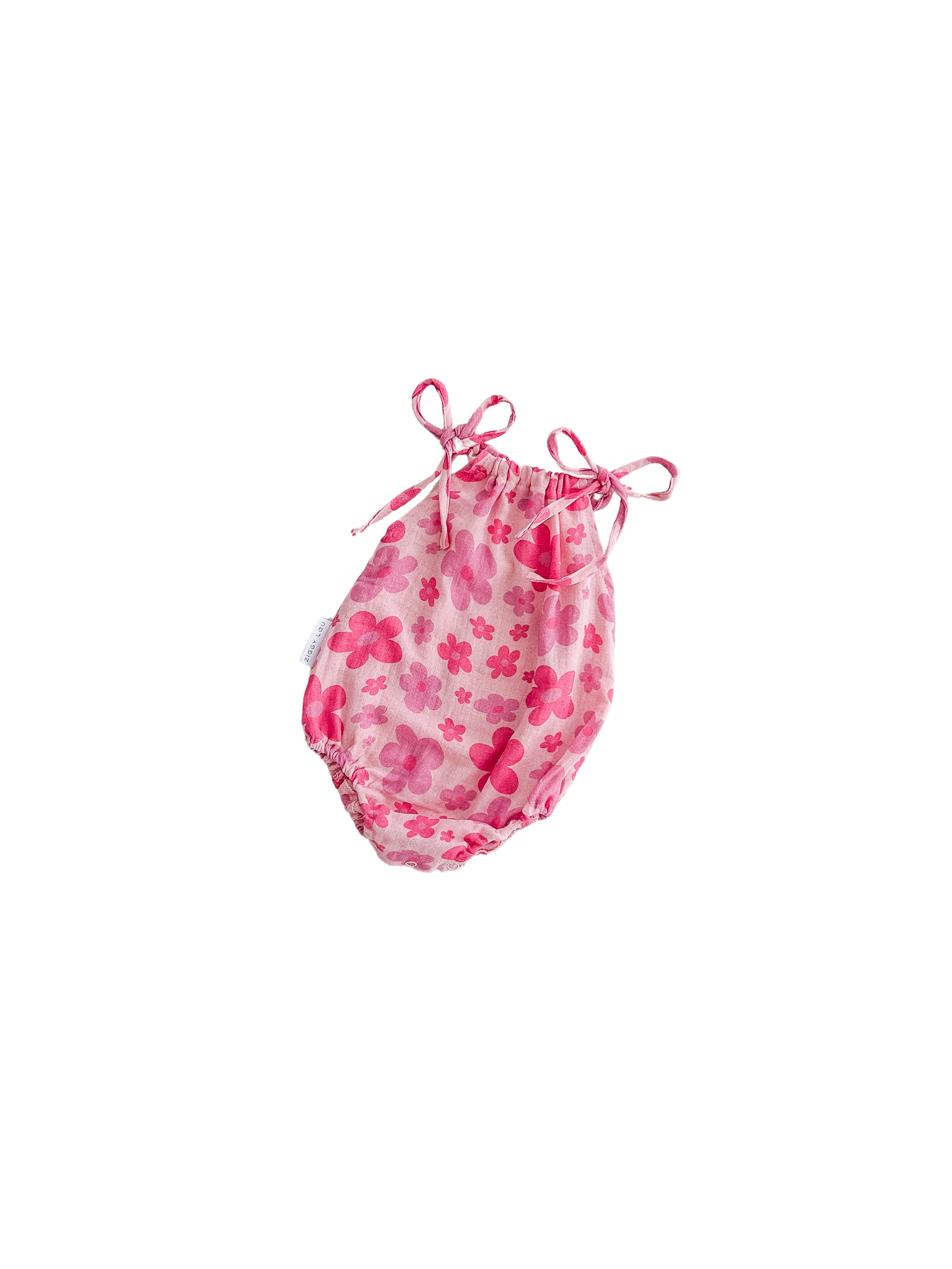 A lightweight cotton romper featuring our Cora printed design. Functional ties at shoulder and snap buttons at the crotch for easy on/off and nappy changes