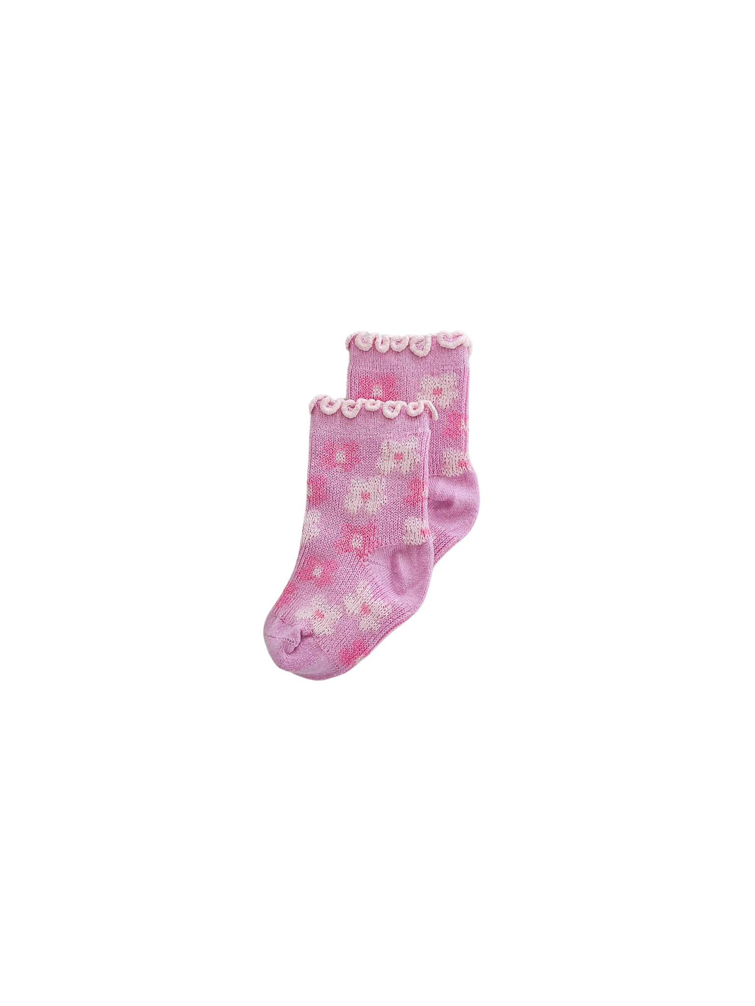 Frill hem sock featuring our Cora floral design on the base colour Lila. Mix and match with items from our Cora, Dahlia + Bamby Collections.