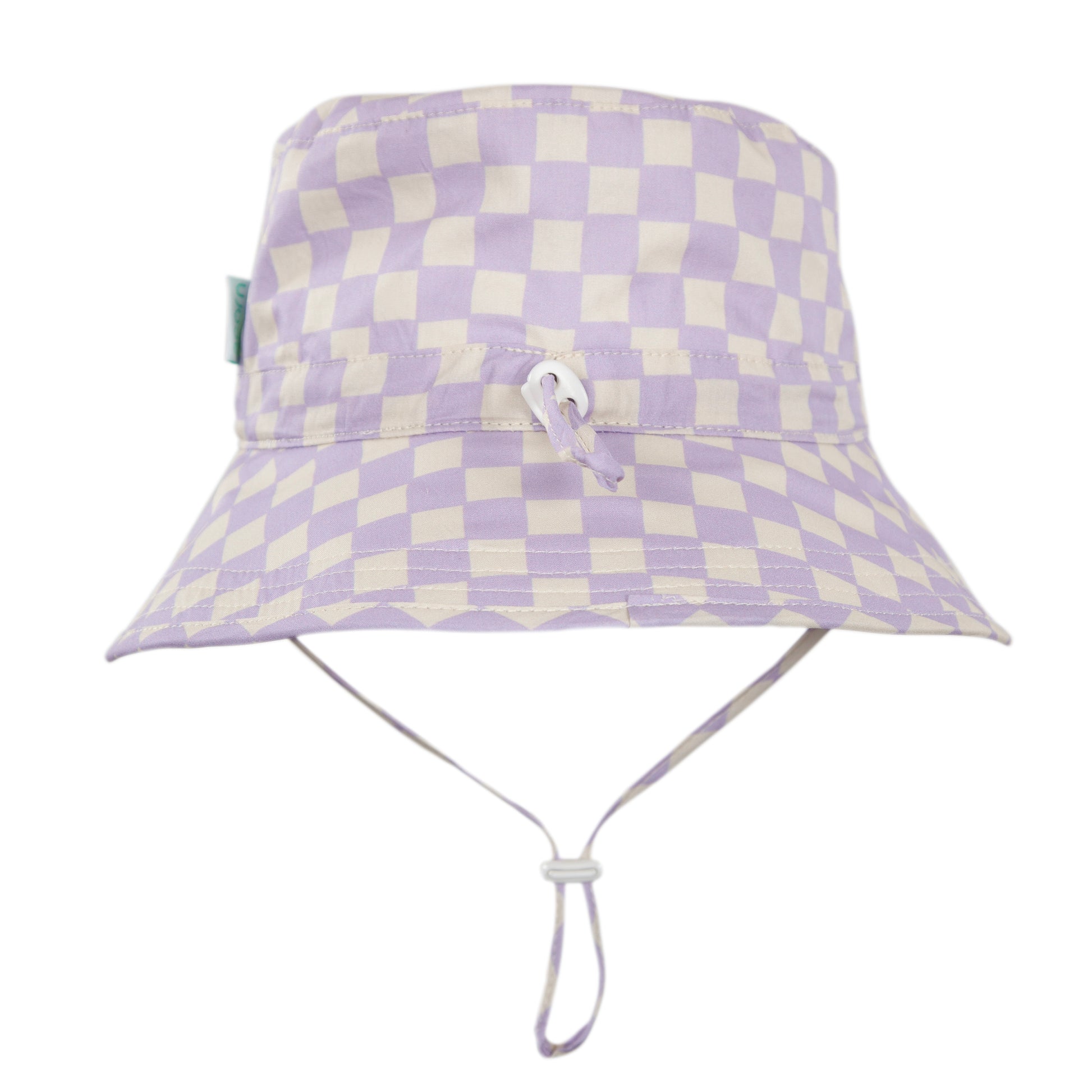 Bucket hat with a lavender cheked print on outside and on the inner brim.