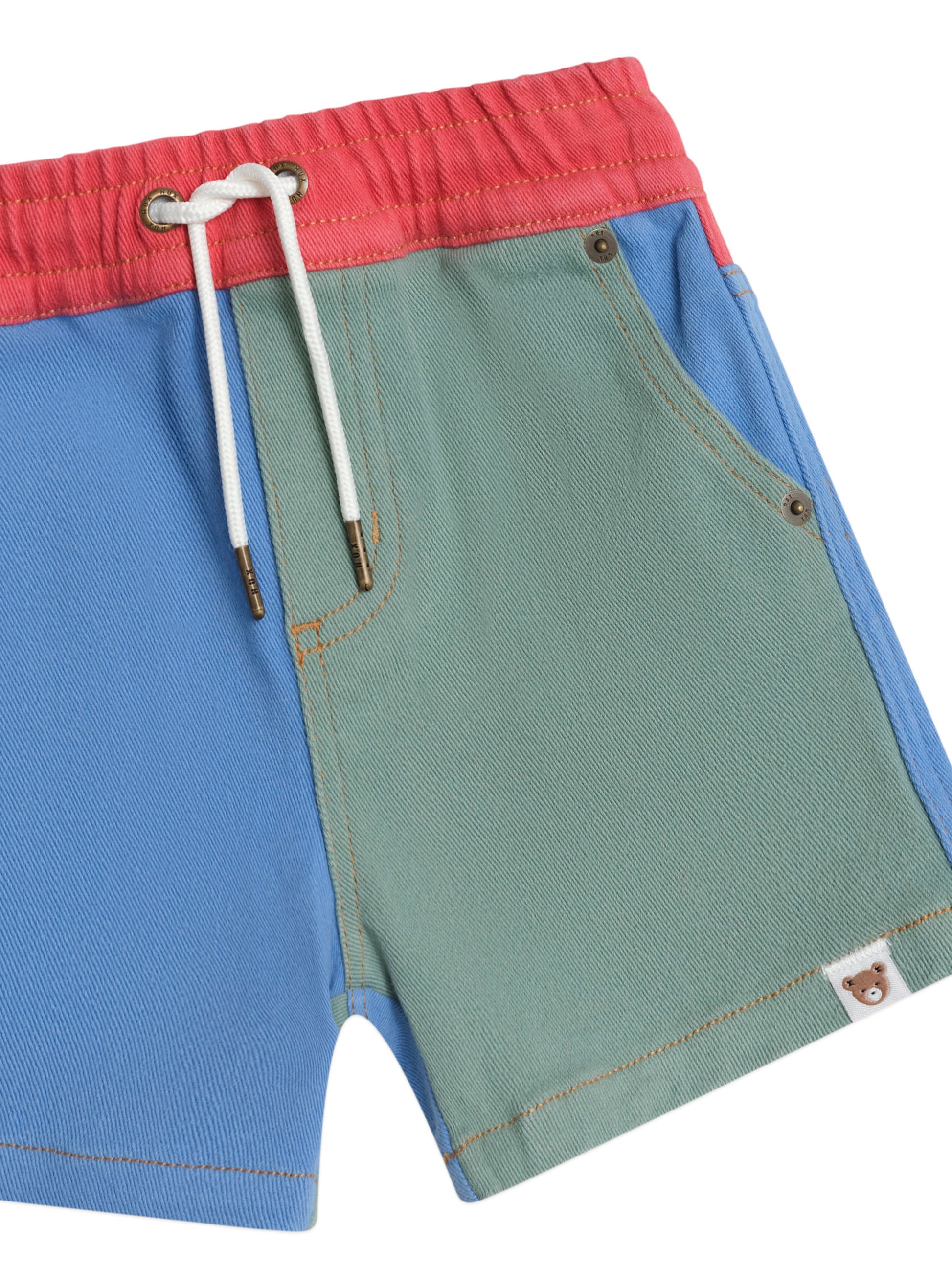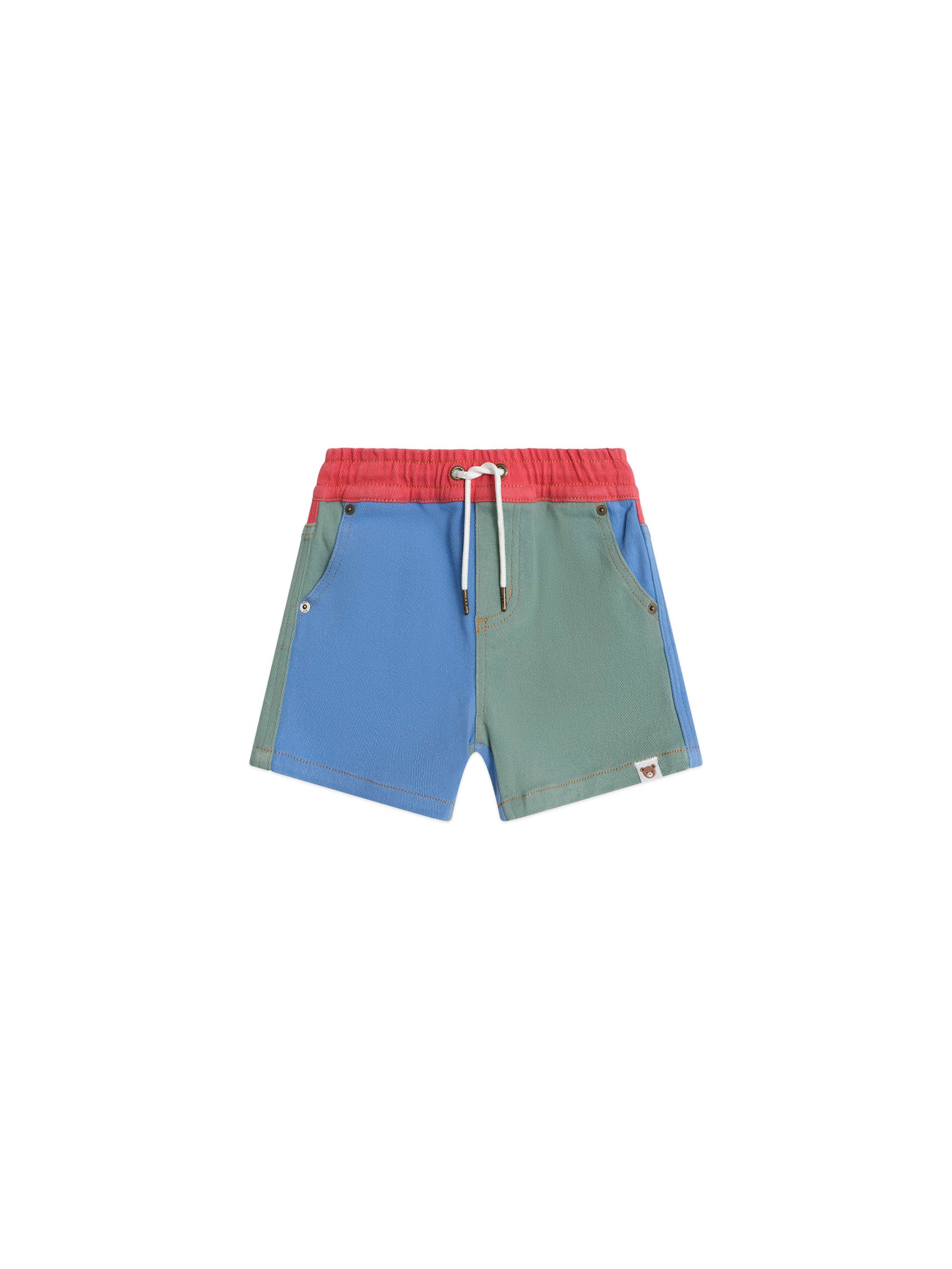 No other shorts compare. Made from the softest colour block denim, they feature a kid-friendly elasticated waistband and adjustable drawstring. Front and back pockets hide treasures perfectly, and an oversized, relaxed cut looks cool on every occasion.