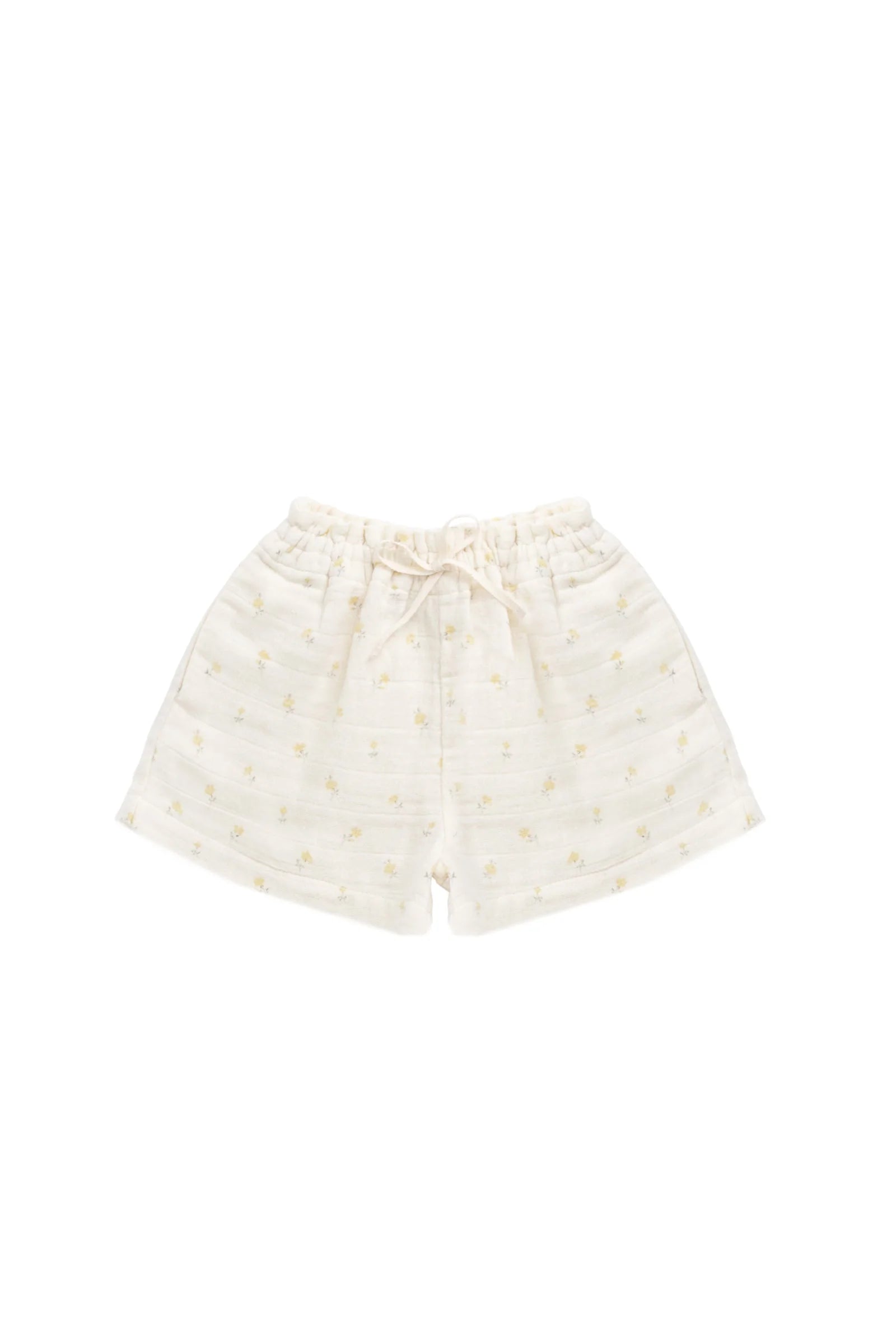 A sweet and practical piece for sunny days. The Emelia Short in Vintage Ditsy is crafted from soft organic muslin and features a delicate floral print in muted yellow tones. With an elasticated waistband, a front bow detail, and two handy side pockets, these shorts are perfect for playtime and everyday adventures.