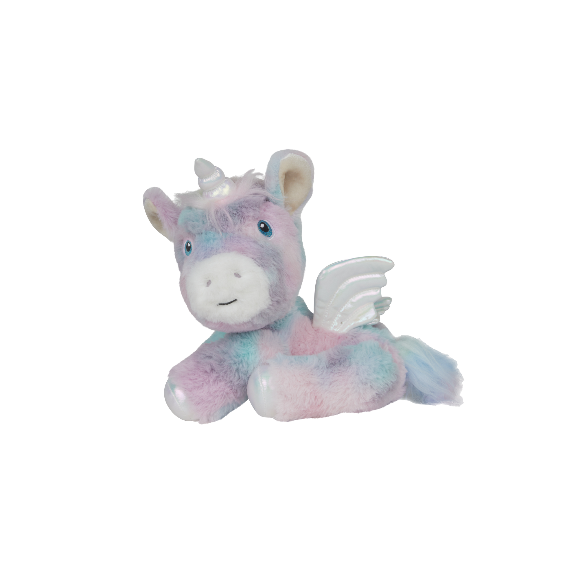 - Iridescent accents on the hooves and wings, velvet inner ears, and a plush rainbow body, tail and mane