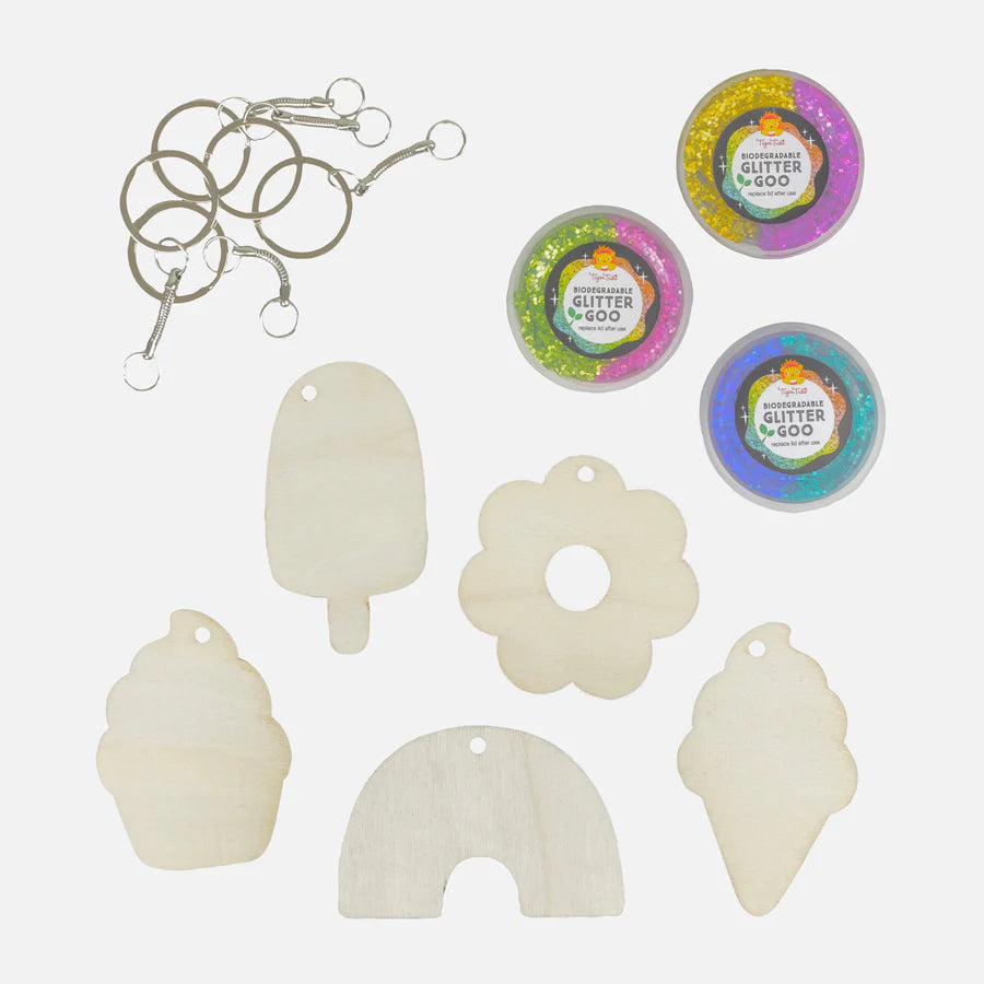 - Each set includes: 5x wooden bag charms, 5x metal keyrings, 6x colours of Glitter Goo