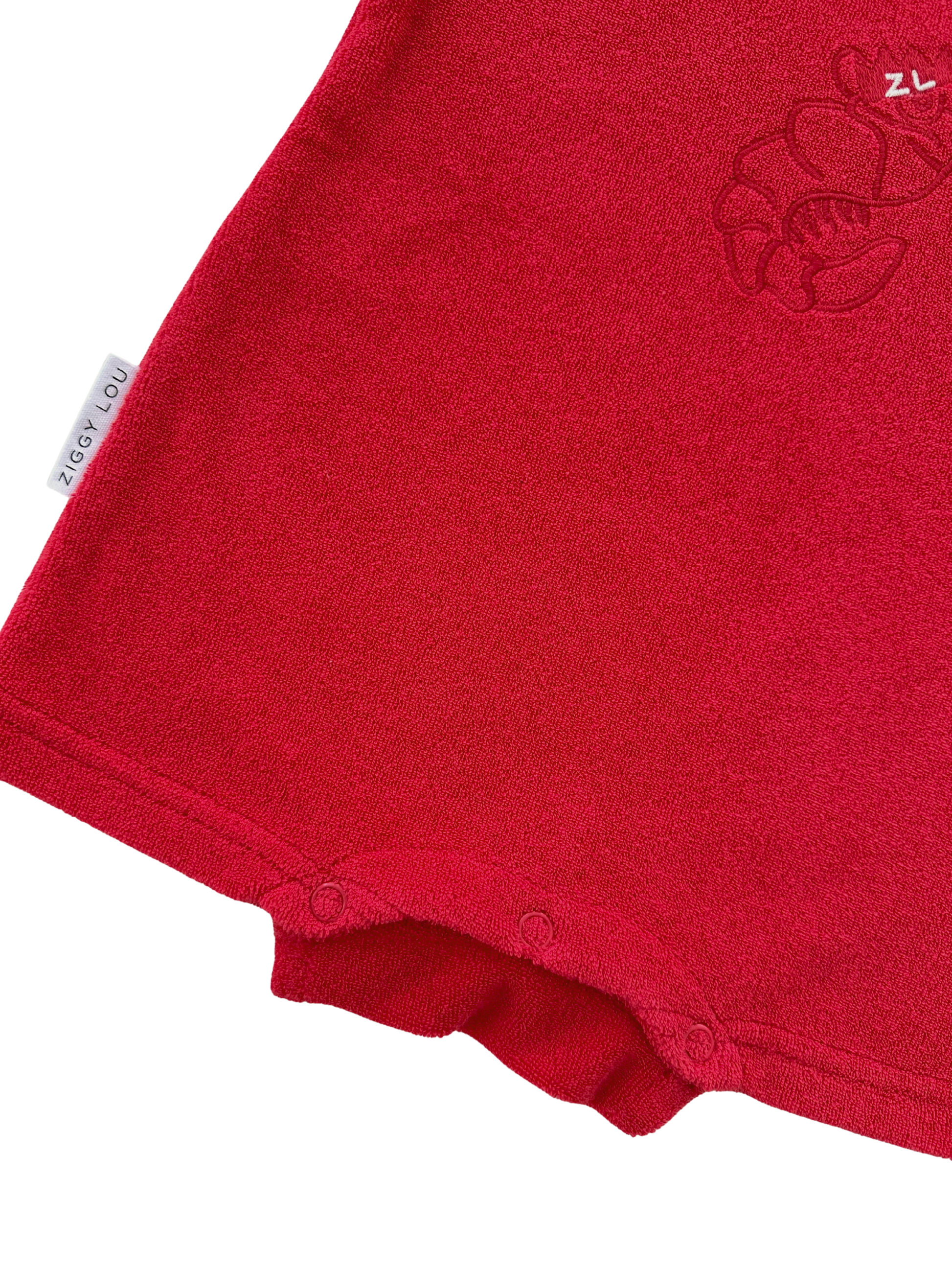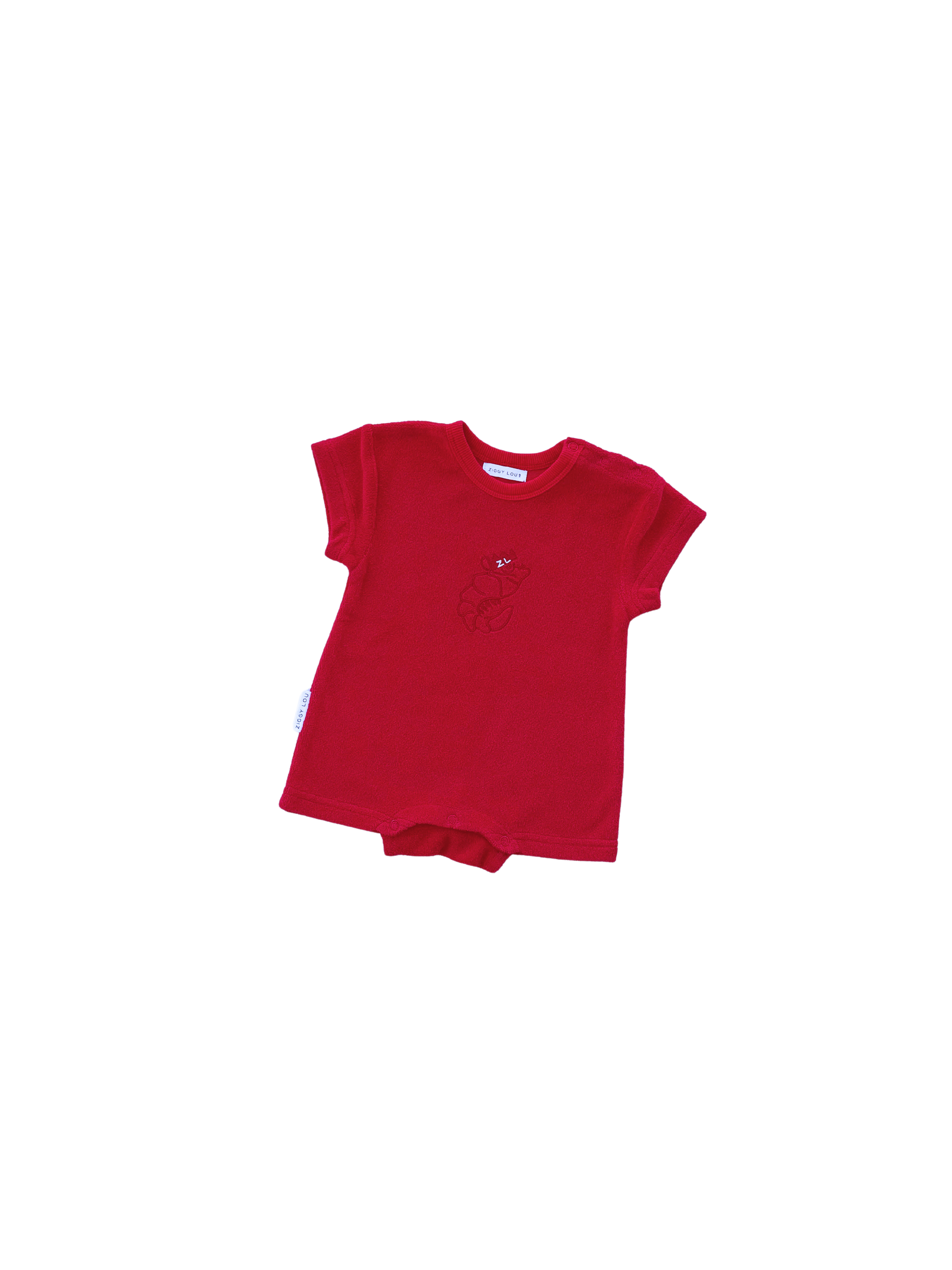 Terry towelling playsuit featuring our Shawn the Prawn design on the front. Functional press snaps at crotch for easy nappy changes and press snaps at shoulders for easy on/off.